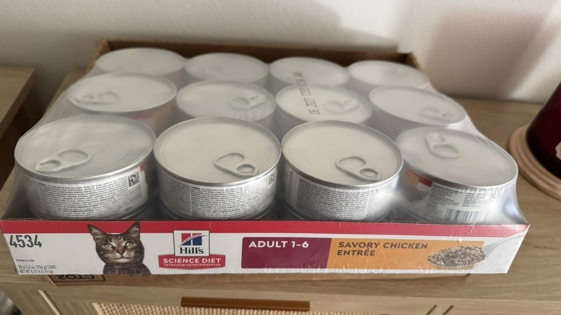 Sealed wet chicken cat food. Never opened, never used. 24 cans at 5.5 oz each.