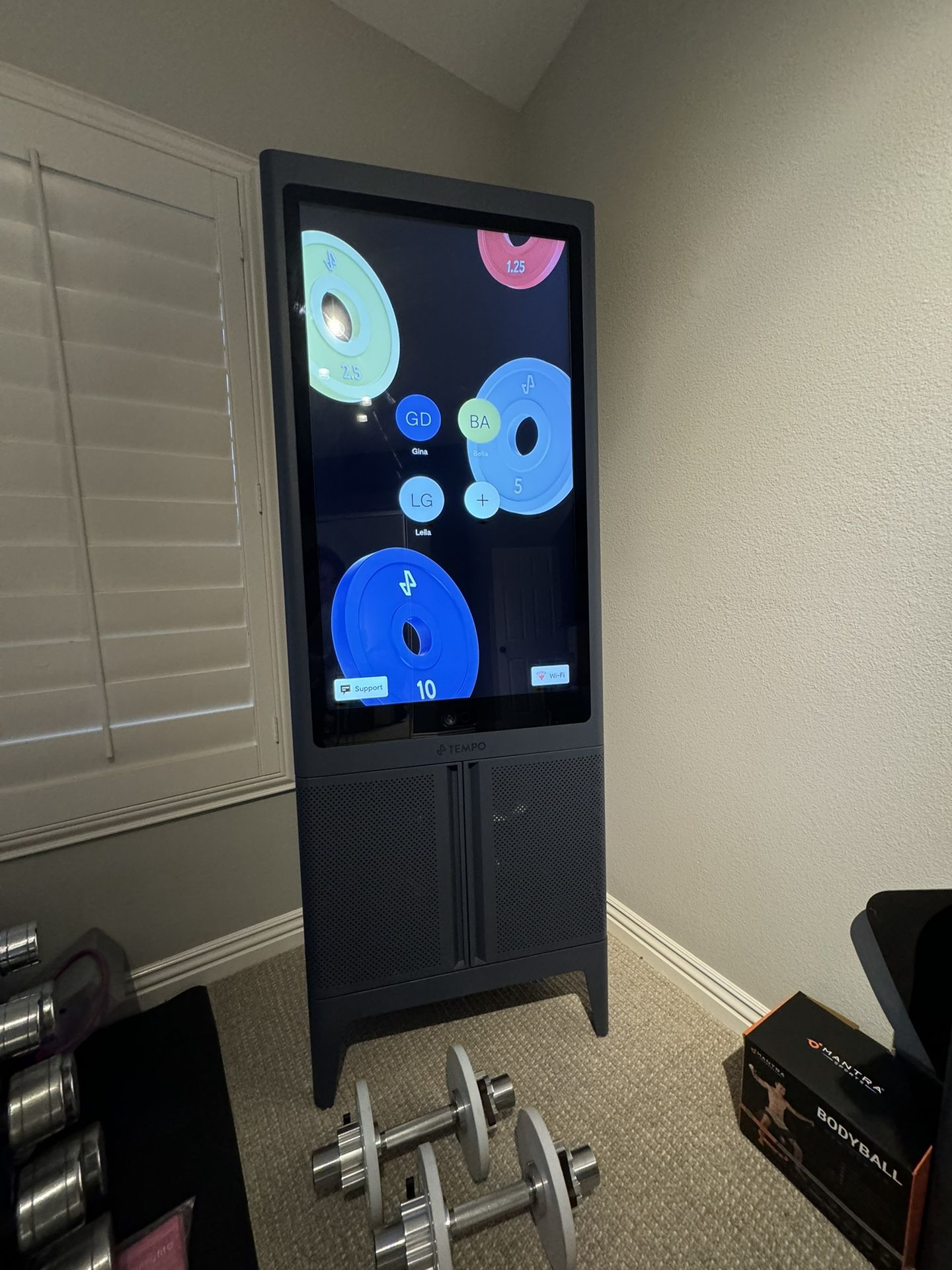 tempo studio - used - dark grey - excellent condition Comes with steel barbells and dumbbells, knurled, non-abrasive handles for slip resistance grips. Also comes with workout mat, set of 4 weight collars, heart monitor. It has everything you need for a full body workout!