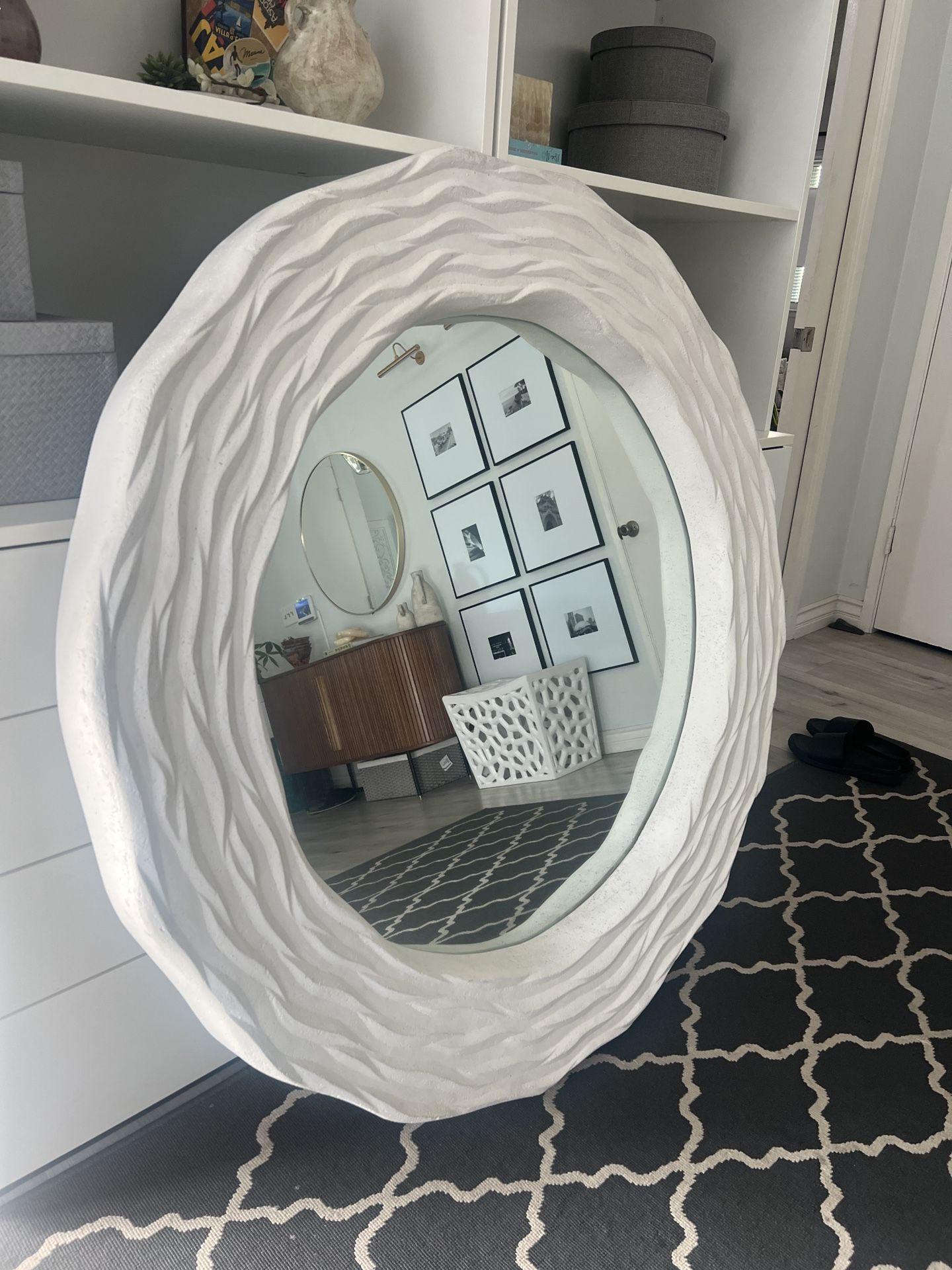 Made Goods Viola Outdoor White Cast Stone Mirror Like New (Heavy) Never Used - has some manufacturer flaws but no structural damage Dimensions: 48” Diameter (outside) 34.5” Diameter (mirror) 3” Depth 60.5 lbs $600 Cash or Venmo ONLY No Delivery