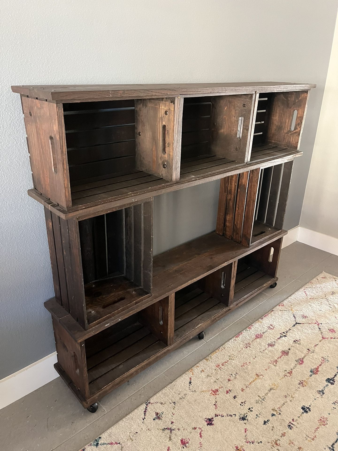 - 55 x 48 x 11 - Very clean and in great condition - Sturdy and versatile - Caster wheels - Baskets (and more not shown) included! - Earthquake straps attached