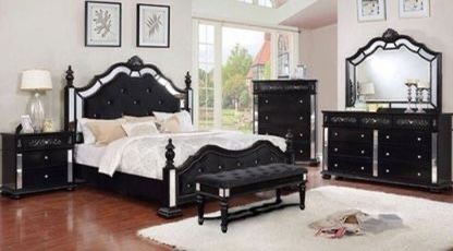 Lavishing Royal Crown Designed Bedroom Set in a Black Chenille Finish with Silver Accents Queen: $1599 King/Cal King: $1699 Includes: Bed Nightstand Dresser Mirror Add Chest: $599 Add Bench: $199 Best Prices in the Industry Guaranteed! - FOA (Mattress Not Included) *No Tax *Pickup in Tracy by Appt *We Can Deliver
