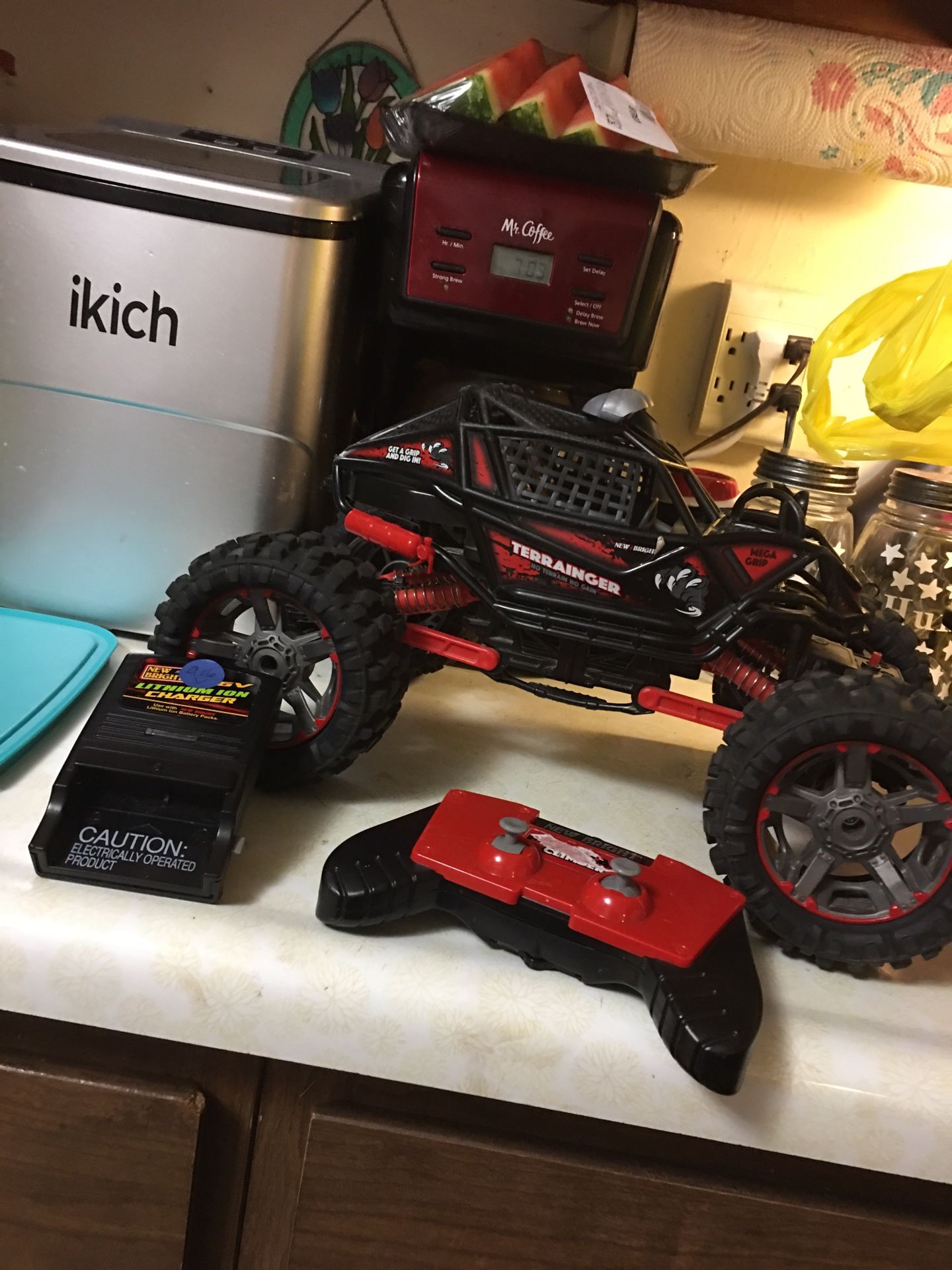 Red/black terraranger r/c car Excellent shape 15 inches long 2.4 ghz Works great Comes with Remote control 9.6 volt rechargable battery Charger Four wheel drive Sold on a first come basis