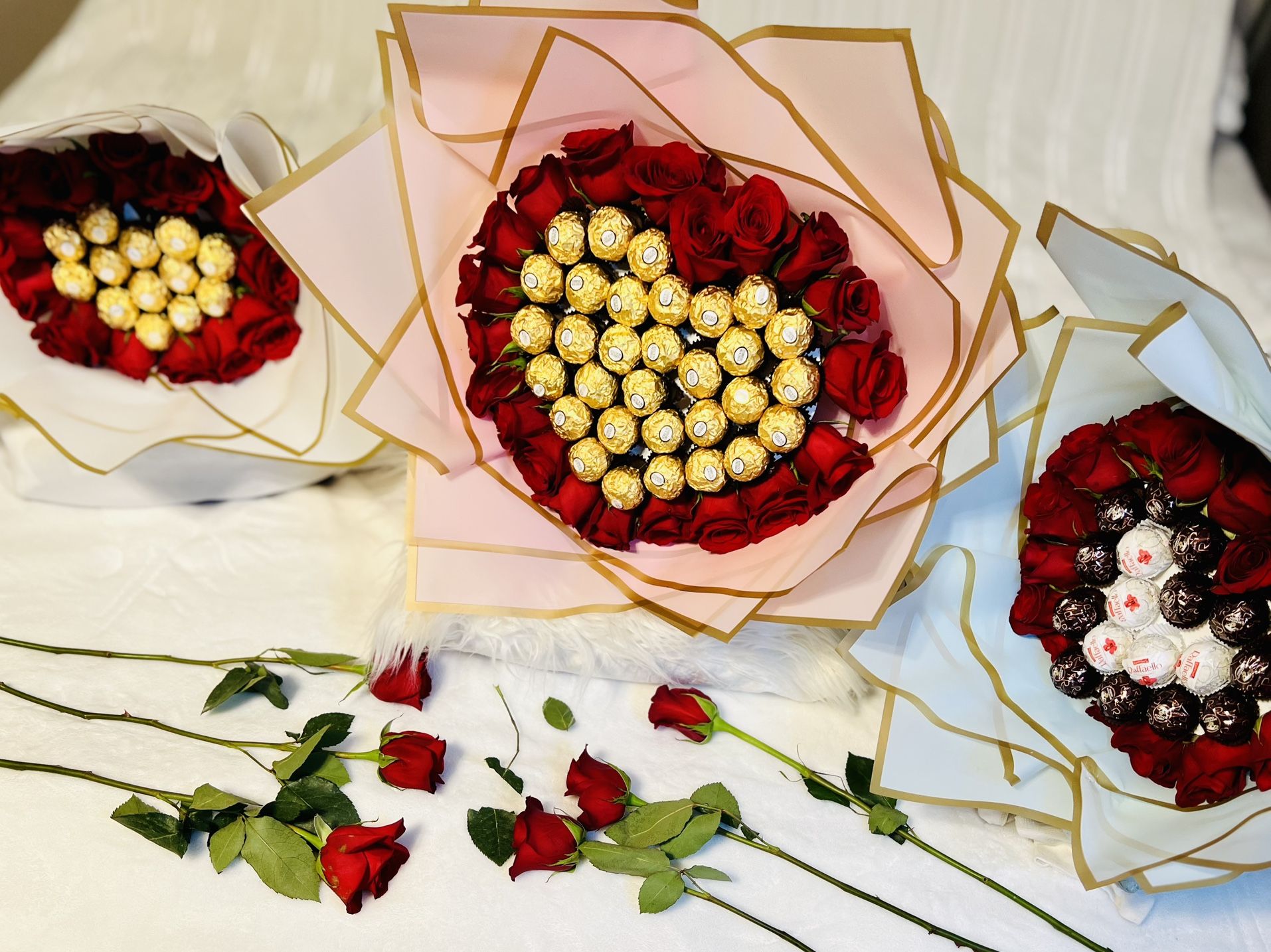 A large has 24 roses 24 chocolates a medium has one and a half dozen 16 chocolates a small is one dozen 12 chocolate the cost of a large is 80 the cost of a medium is 70 the cost of a small is 60