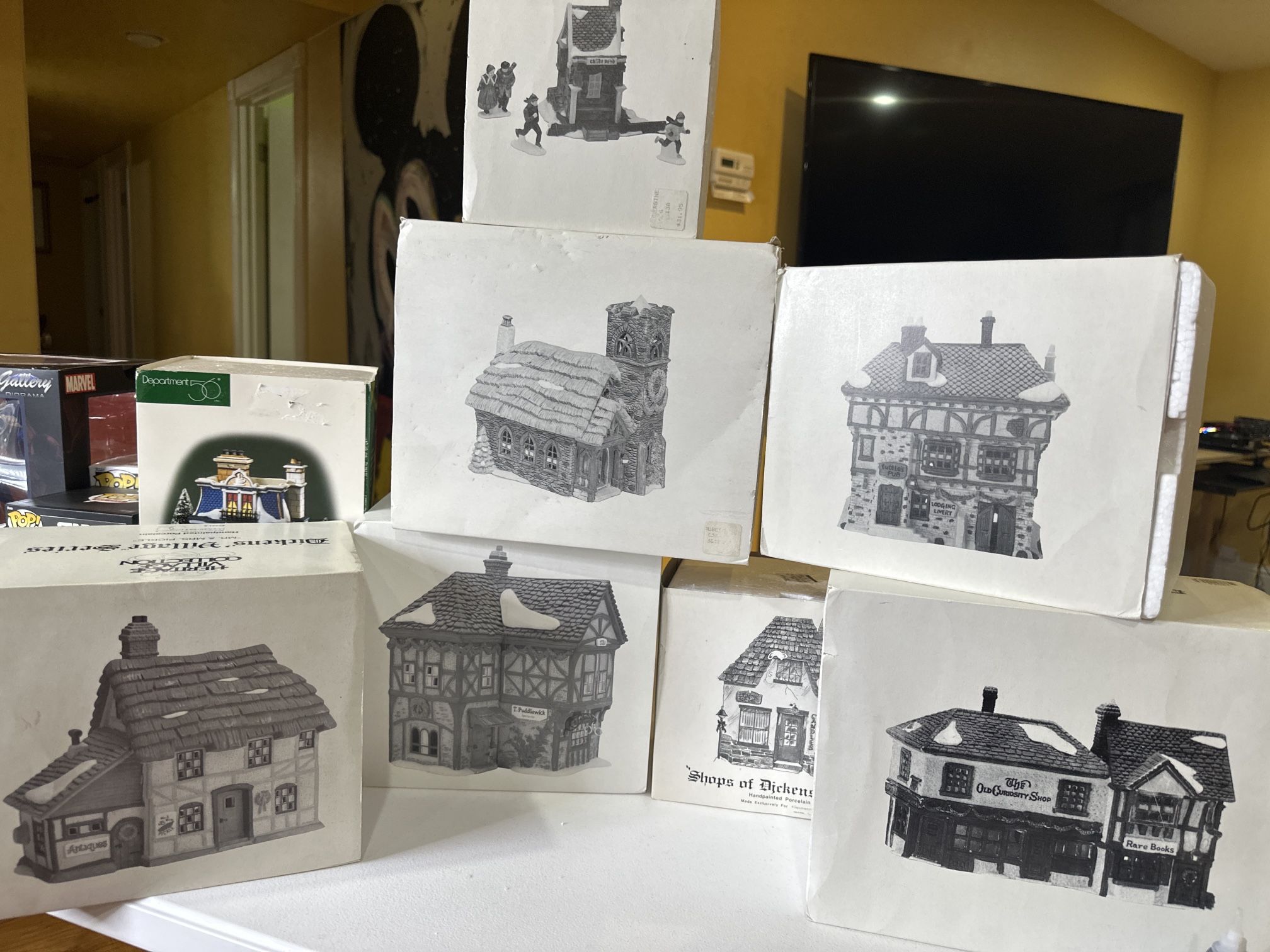 Lot of Department 56 Dickens’ Village hand-painted porcelain buildings. Classic Christmas village pieces. Includes multiple houses/shops as shown. All 8 pieces include original boxes (boxes show storage wear).