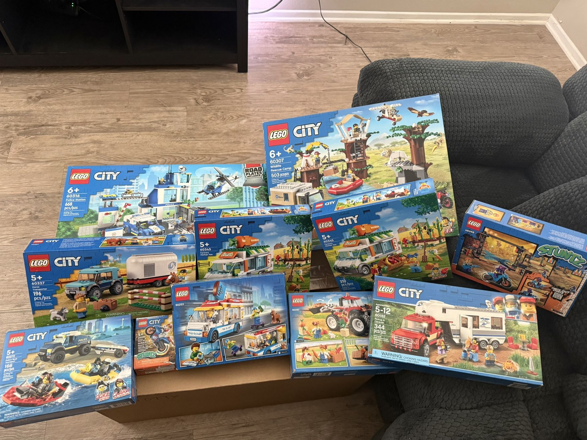 QTY: 11 some boxes have some damage but all are sealed! Sold as bundle or individually asking full price! Lego city #60316 - 200 Lego city #60307 - 60 Lego city #60327 - 40 Lego city #60345 x2 - 50 each Lego city #60272 - 35 Lego city #60253 - 40 Lego city #60287 - 25 Lego city #60182 - 90 Lego city# 60298 - 5 Lego stuntz #60340 - 25