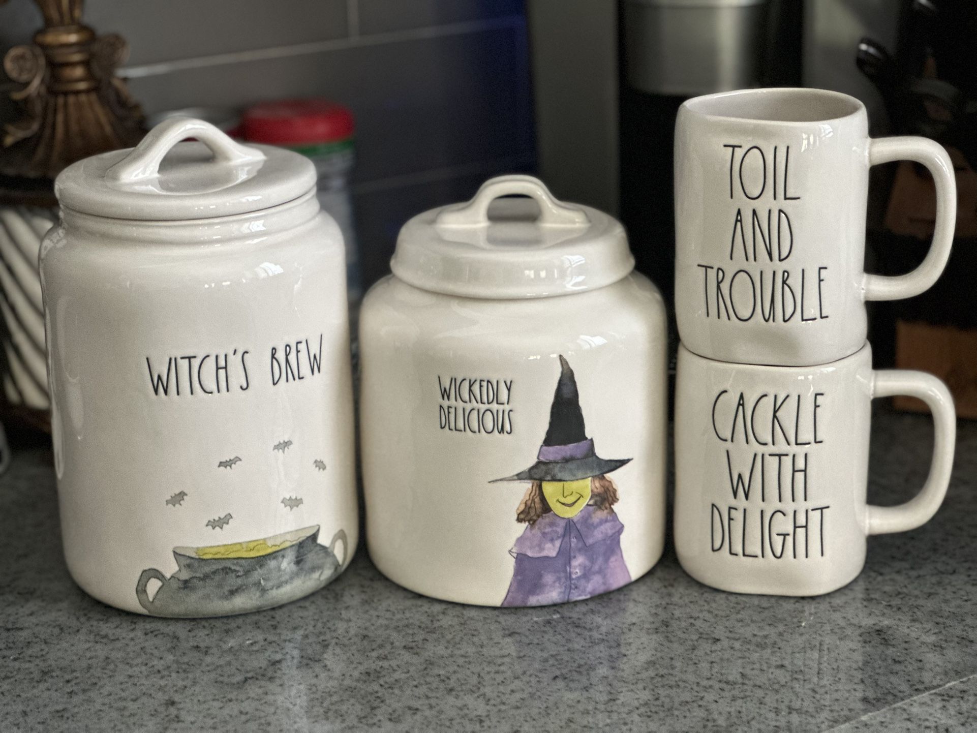 Brand New Rae Dunn Halloween Coffee Canisters and mugs 1 Witch’s Brew Canister with image 1 Wickedly Delicious Canister with image 1 Toil and Trouble Mug with image 1 Cackle with Delight mug with image