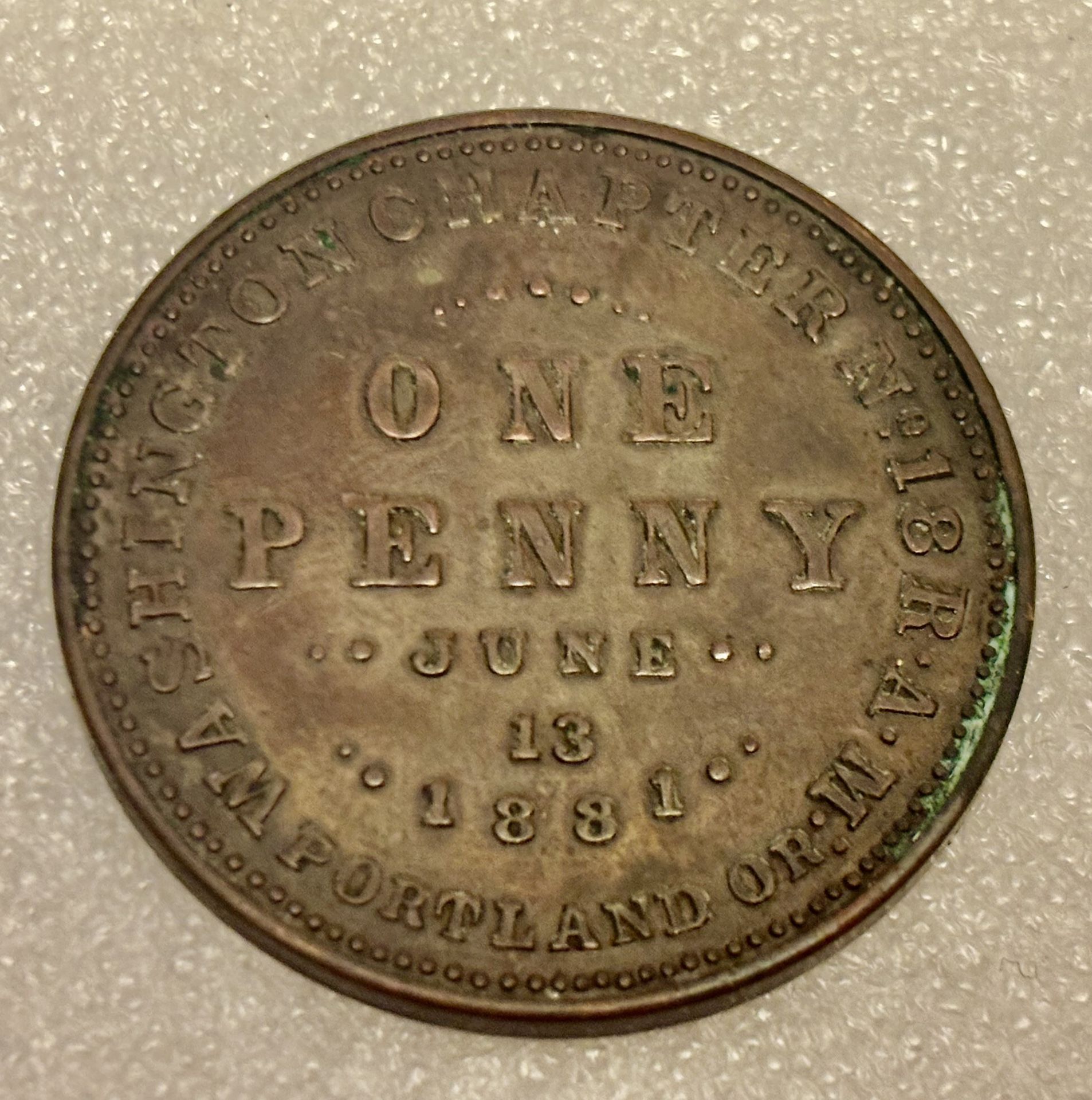 Washington chapter No 18 penny token 1881 Portland Oregon. Antique, collectible, good For collection, hobby, history, fun