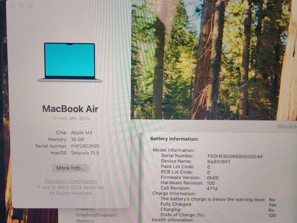 Like new - 12 power cycle MacBook Air M4 Model: A3240 13 inch Color: Sky blue RAM: 16GB GPU: 8 core M4 chip Storage: 256GB No box Serial number on photos No damage, no scratches, new charger and cable. Pickup only, u-district 98105.