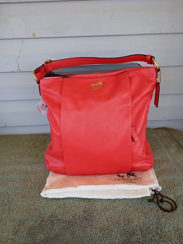 Coach Madison Isabelle Hobo in the color papaya, which is a bright pinky-orange hue. It is also identified by the style number 21224. This style of bag is a versatile leather handbag that can be carried by a top handle or as a crossbody bag with a longer, detachable strap. It features a snap closure, fabric lining, and a zippered exterior pocket hidden under a front pleat. Brand new comes from a Smoke and Pet Free Home it does include the original box and dust bags, all zippers work perfectly fine no issues no stains or rips see pictures for more details. Condition: Brand new with tags Style number: 21224 Color: B4/B30 - Brass/Papaya Material: Leather Will bring the right amount of "pop" to any outfit! + Inside zip, cell phone, and multi-function pockets + Snap closure, fabric lining + Top handle with 10" drop + Longer strap for shoulder or cross-body wear + Approximately 13" length x 12" height x 4" width See pictures for more details