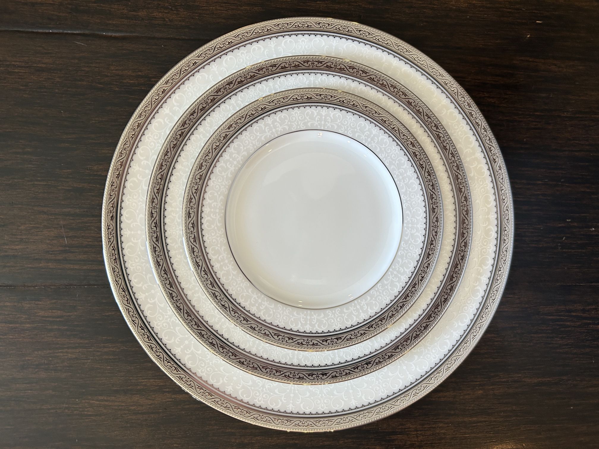 Naritake Odessa Platinum Bone China Set Were gifted these for our wedding and never used them. Still in the box. Converted our dining room to a play room so will never use. Set includes: 12 Dinner Plates 12 Salad Plates 12 Bread and Butter Plates 1 Round Vegetable Salad Bowl 1 Oval Platter