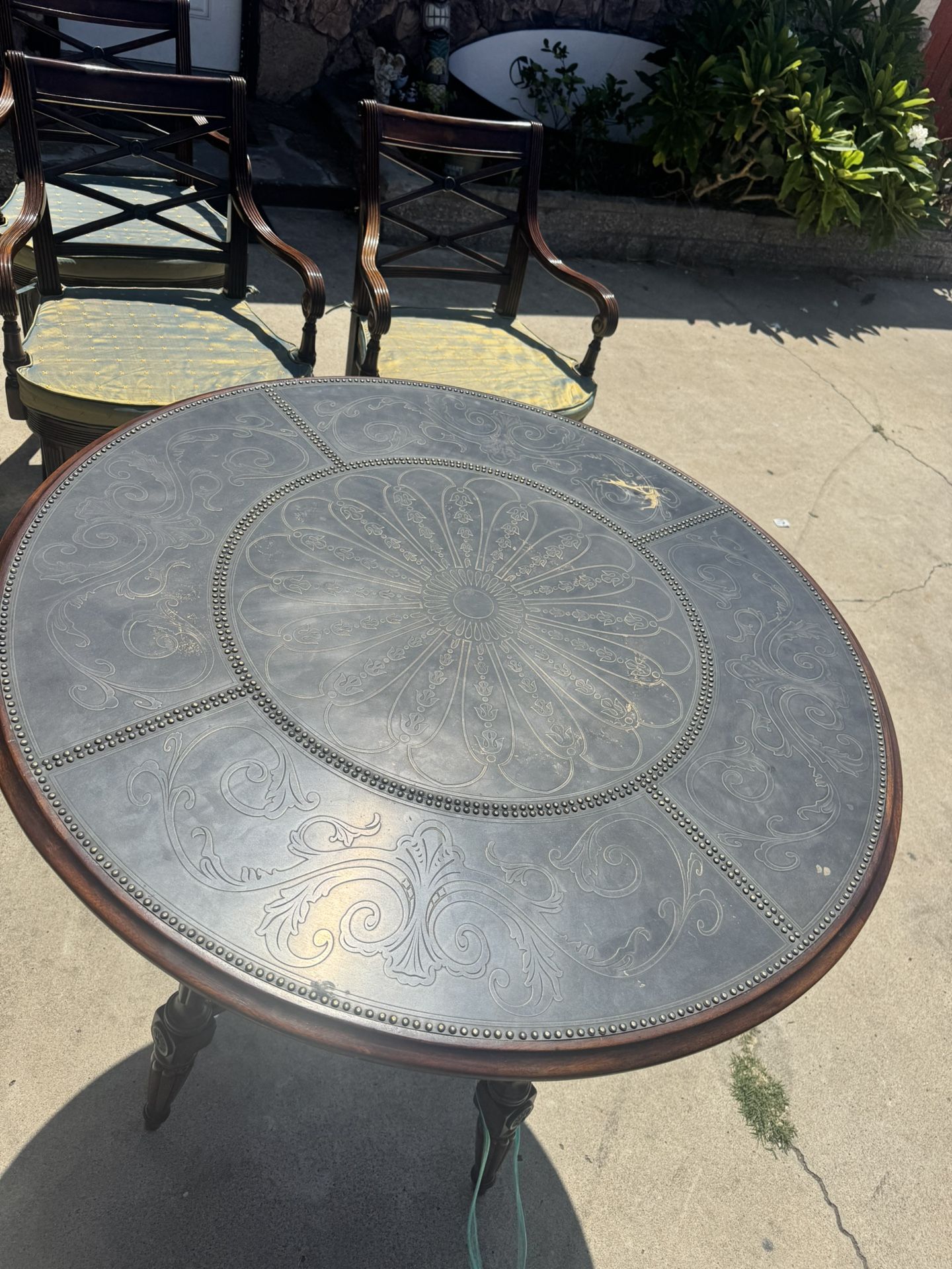 Brand is Theodore Alexander Copper top with 4 high chairs. Original new price is over $2k.