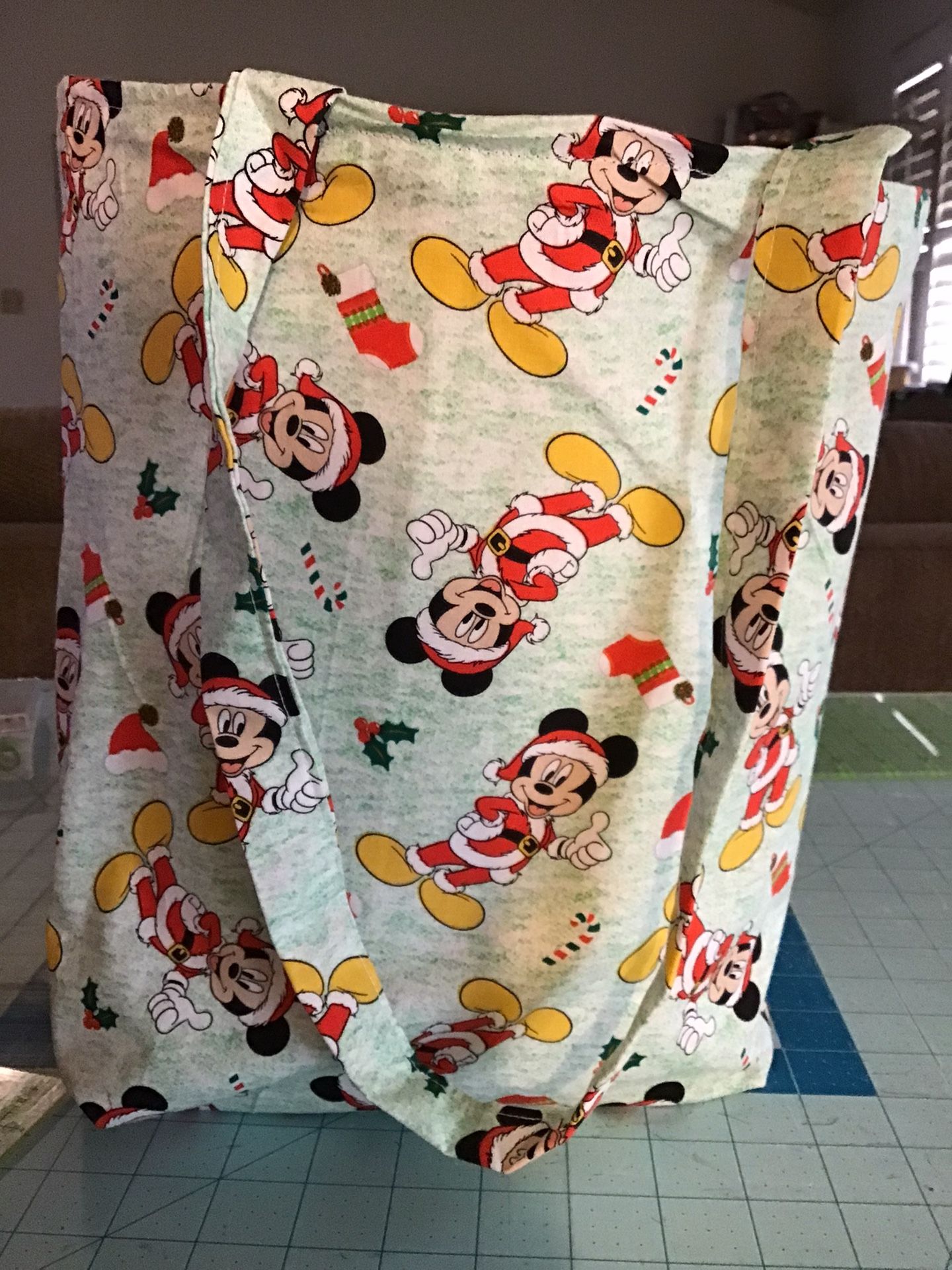 Handmade mickey mouse xmas bag. Size 16 by 16 inches. Has red lining and pocket inside
