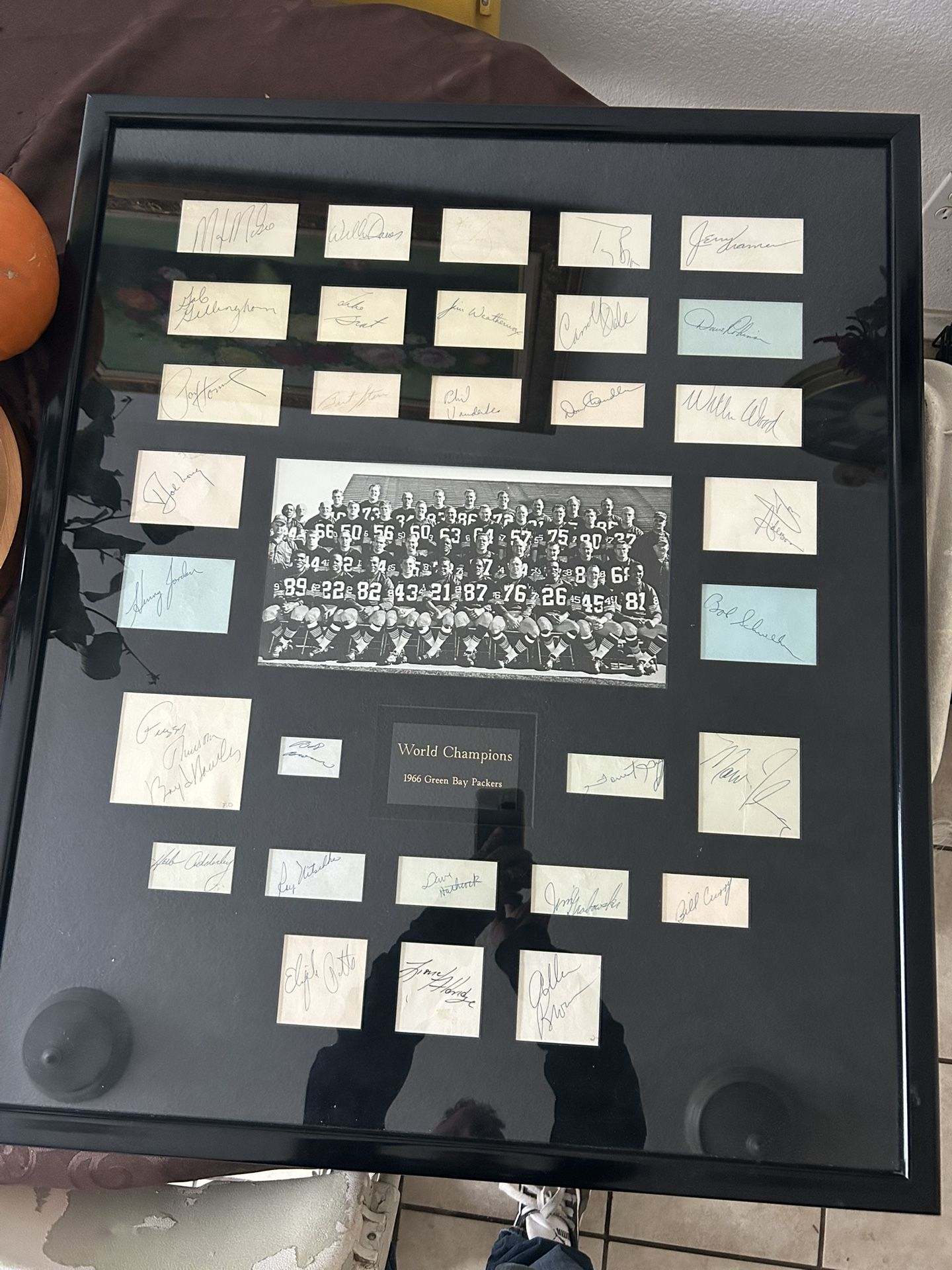 for sale a Awesome 28x34 framed photo of the Green Bay Packers the championship of the first ever Super Bowl it has 31 hand written Signatures including Bart Starr On January 15, 1967, the Green Bay Packers of the National Football League (NFL) smash the American Football League (AFL)'s Kansas City Chiefs, 35-10, in the first-ever AFL-NFL World Championship, later known as Super Bowl I, at Memorial Coliseum in Los Angeles. Asking $1500