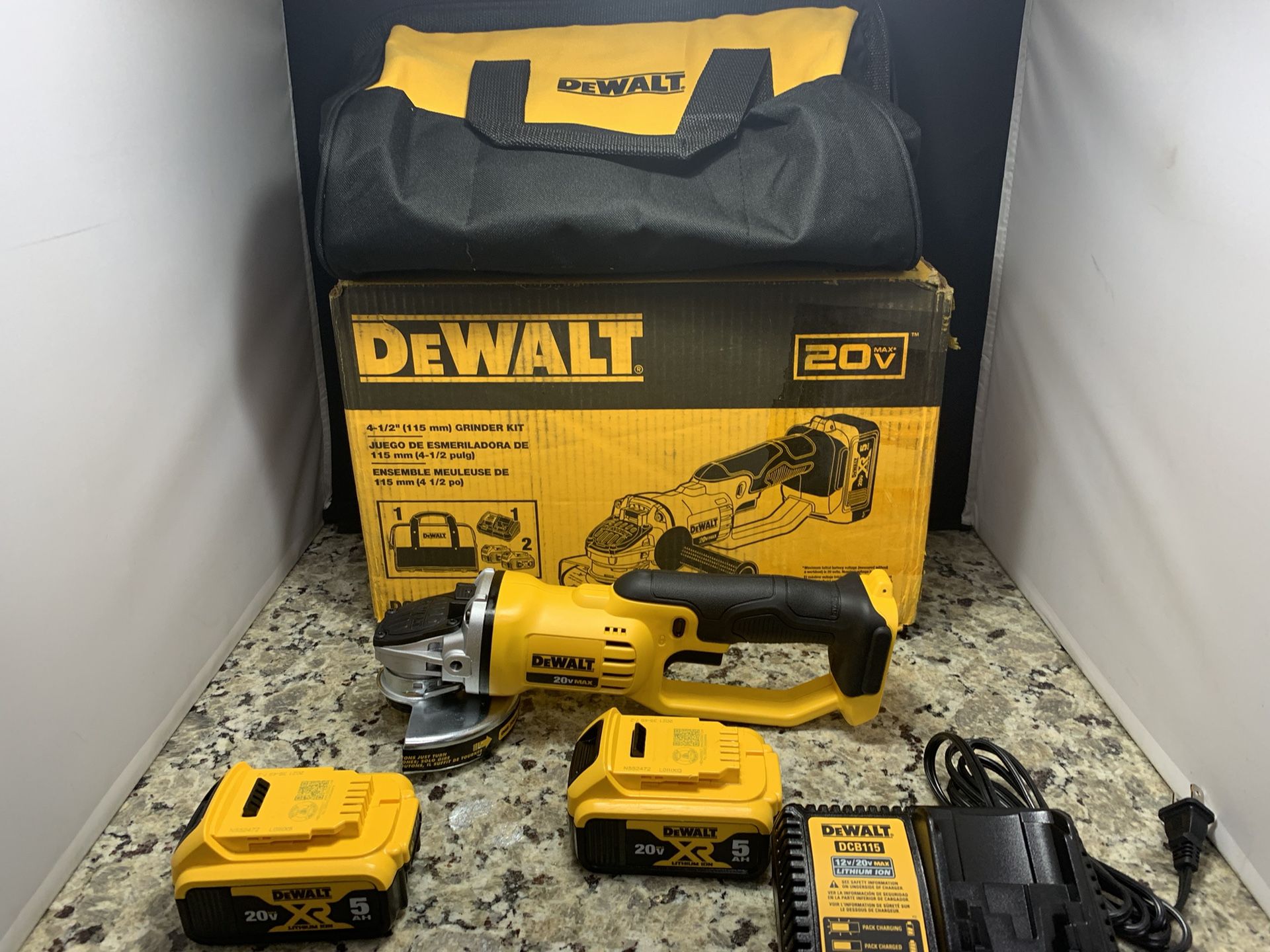 DEWALT (DCG412P2) -4-1/2” grinder kit with 2x batteries with charger And carry bag in original box