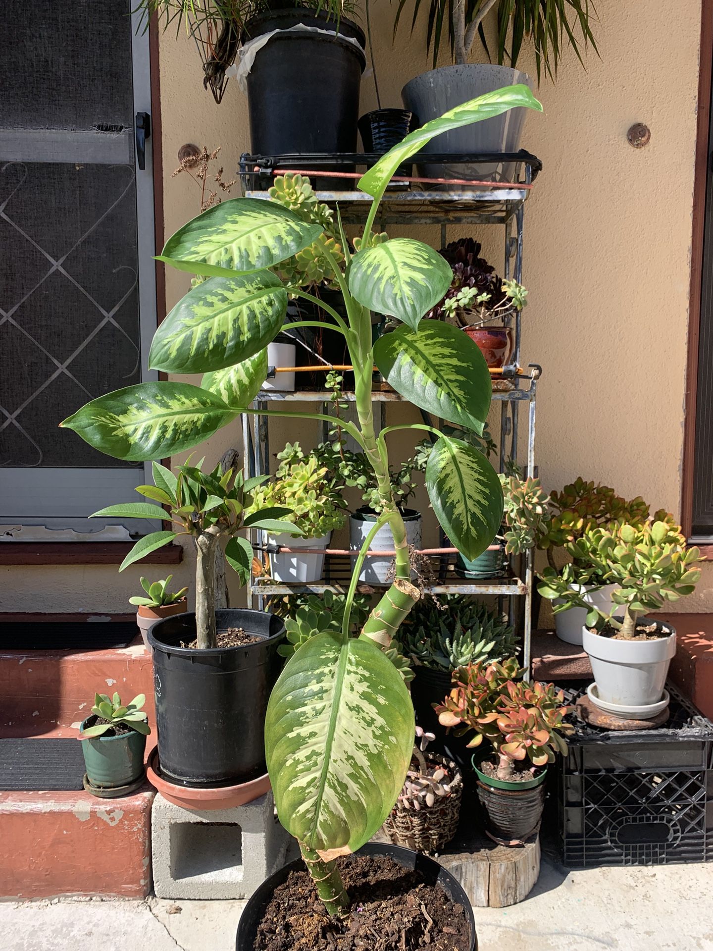Healthy curved dumb cane plant 38” from top of soil. Comes with 12“ x 12“ metal pot. I’ve got a couple inches of small rocks in the bottom to elevate the inner liner. I can dump that out if you don’t want it. The only reason I’m selling is because it’s outgrowing my window. Great indoor plant. ** The lowest leaf is gone. The last two pictures updated 11/12/25. My cross streets are Sawtelle and Pico.