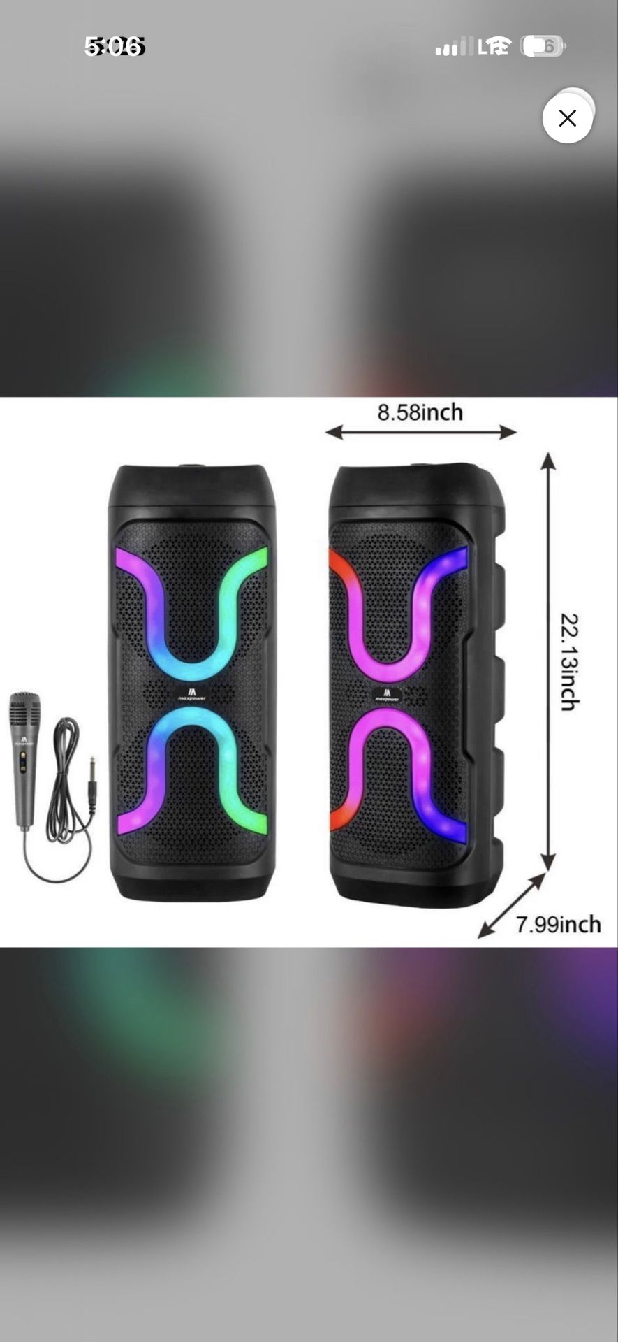 Powerful portable speakers 2 8” speaks with vibrant RGB LED lighting. This unit has a black mesh grill and comes with a wired microphone for karaoke. It is made of durable plastic and features a tall, cylindrical design for great sound projection. Brand new in the box never opened.