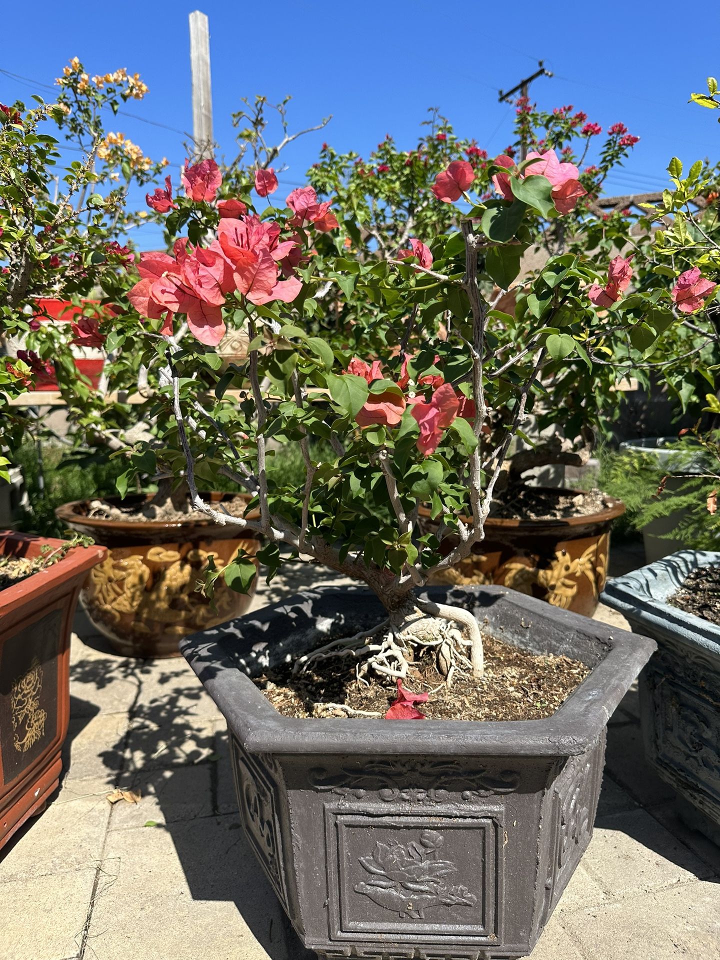 Very nice bonsai bougainvillea flowers and cement bonsai healthy tree and easy to take care sell price $230 includes the pot pick up Anaheim city