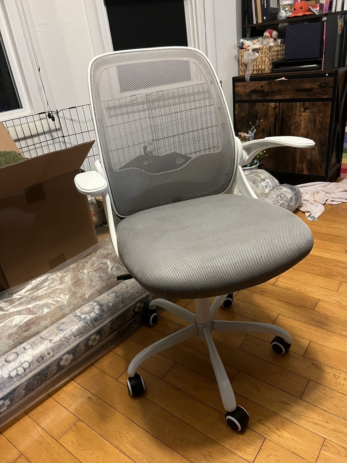 Breathable back and seating Holder in the back Handle on the side Looks a bit dirty in the pictures because I tried to clean it up and sadly it looks like just smudged water and probably layered dirt. Chair works well, I would just cover the seating if aesthetic is not there for you.