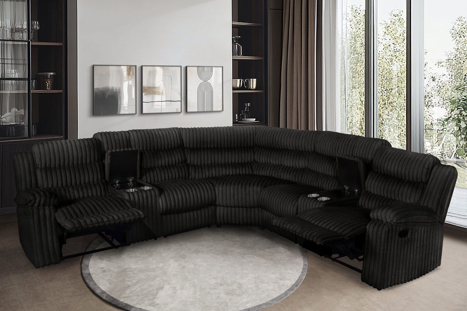 A spacious black corduroy sectional featuring manual reclining, pillow-top armrests, and dual storage consoles with cup holders.