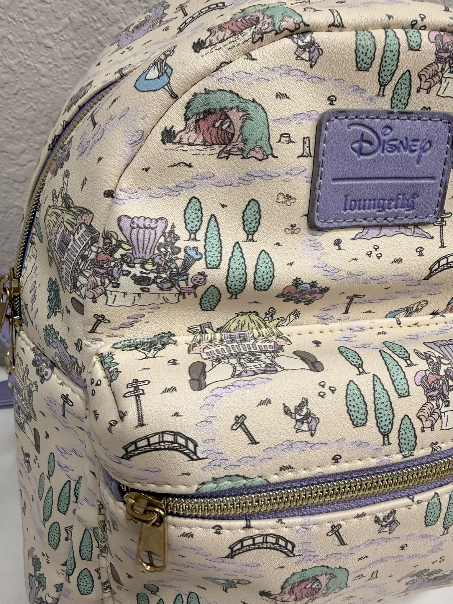 This is a Loungefly Disney Alice in Wonderland Pastel Map Mini Backpack, featuring a pastel design with various scenes from the movie Used, still in good condition. See all pictures. Pick up in Bloomington All sales are final