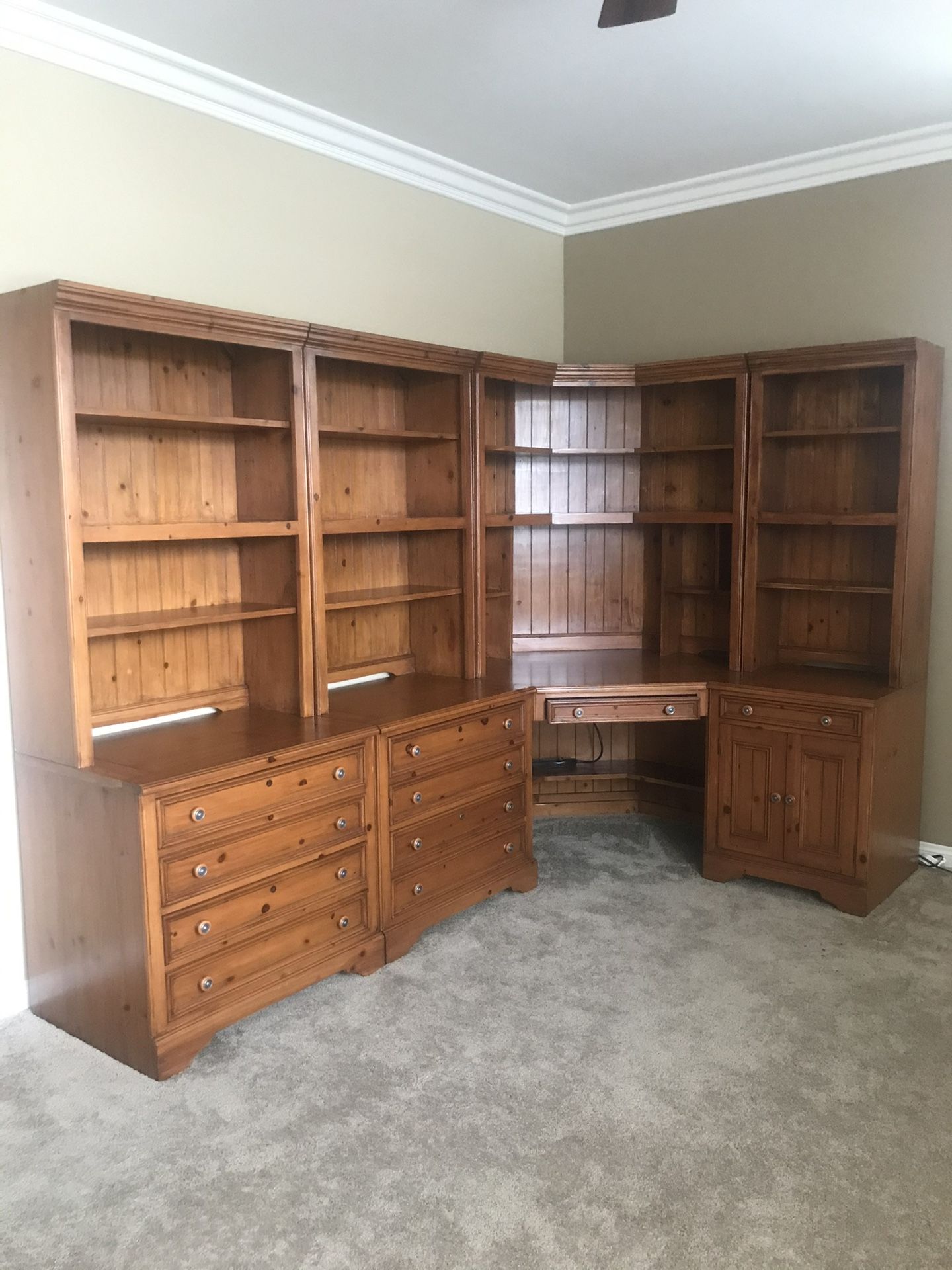 8-piece large desk/bookcase/file storage furniture set includes: -1 corner desk -2 large filing/storage drawers -1 storage cabinet with small drawer -1 corner bookshelf hutch to go on top of the corner desk -3 bookshelf hutches to go on top of the storage drawers/cabinets. Can configure the layout of each piece, can even choose to use just the drawers without bookshelves, etc. This is a great piece of solid furniture that served us well. We moved into a new place that can’t quite accommodate it, so that’s why we’re selling it. $300 OBO.