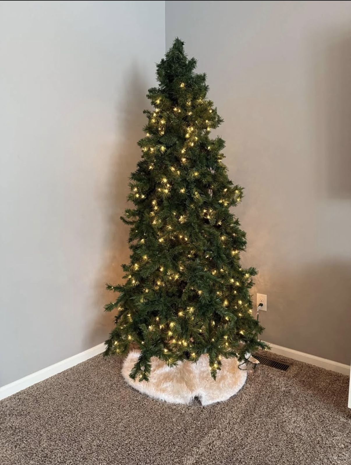 Skirt not included Very small portion of lights at the top of the tree don’t work. As pictured.