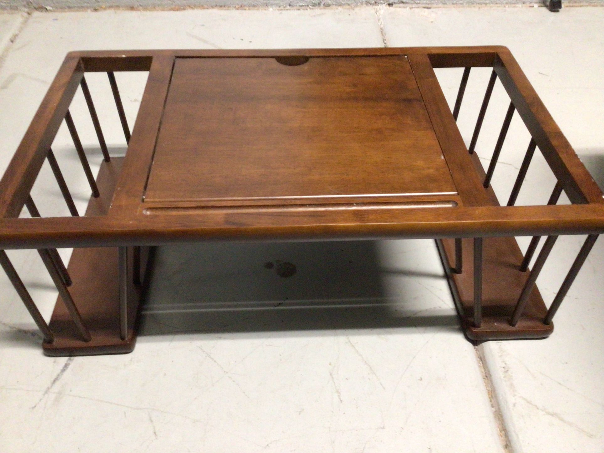 Bed table that sets on your lap in bed or a recliner. Top lifts to support a book . Has side compartments. All wood construction.