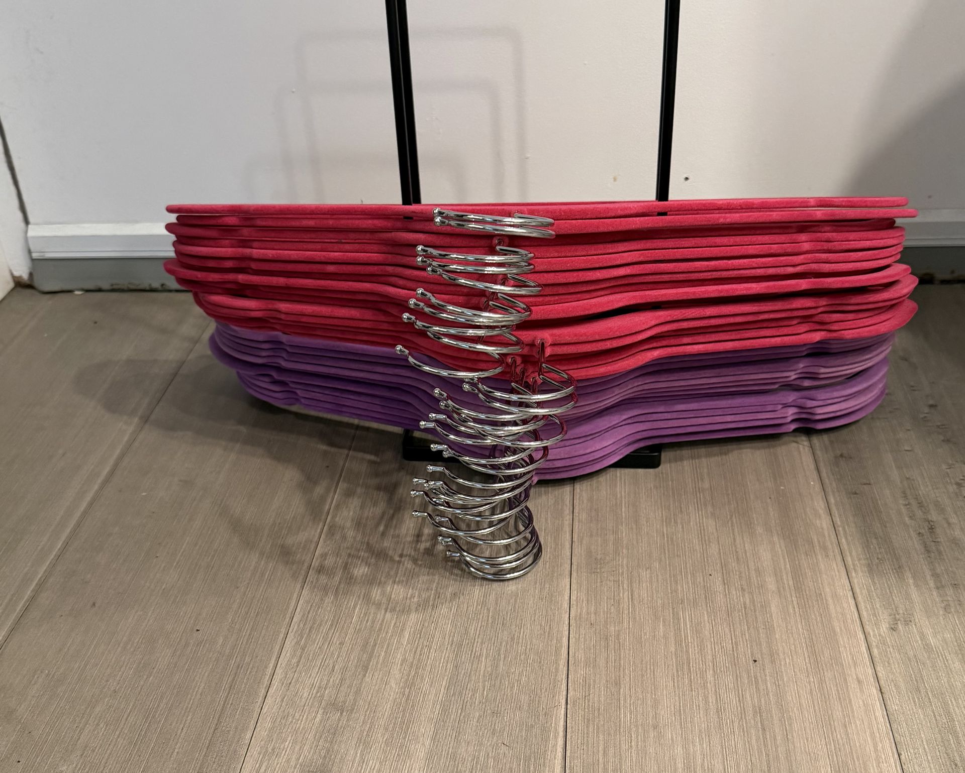 Set of 30 thin velvet hangers in pink and purple. Non-slip and great for saving closet space — perfect for apartments and small closets. Good condition and sturdy. Keeps clothes from slipping and helps maximize hanging space. No scammers or flakes please! And cash only!