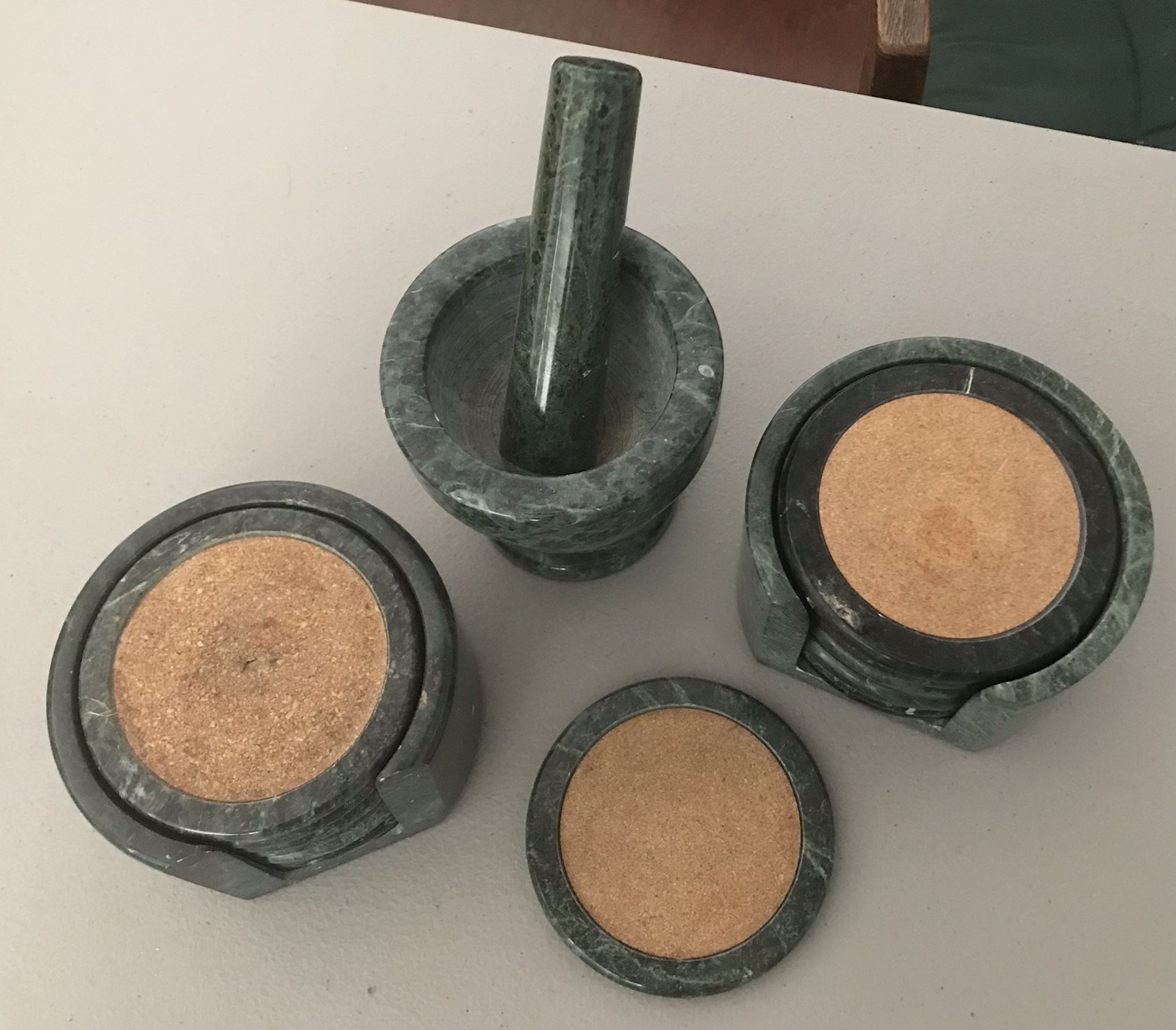 Genuine green marble coasters (2 sets of 6) plus green marble mortar and pestle. 13 coasters in all. Excellent condition. Each set sells for $55 to $80 online. Will separate. Great for guests. Public meet.