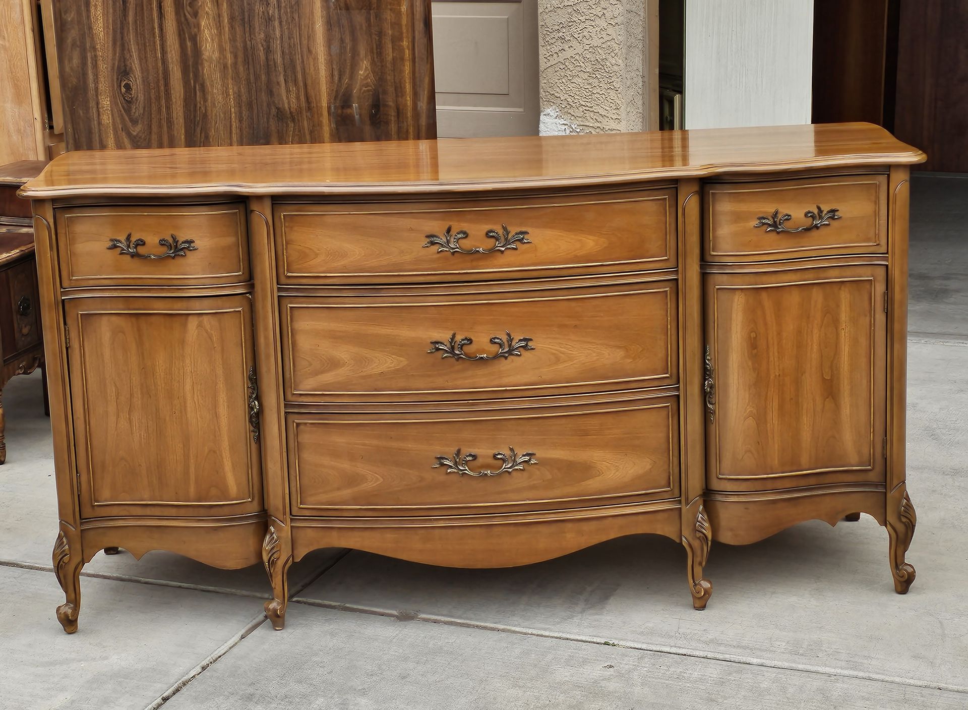 Vintage French Provincial Buffet in good condition. Has a little bit of wear on top but nothing major. Has 5 dovetailed drawers that work well. Cabinet doors both open to a single shelf. 66×18×34