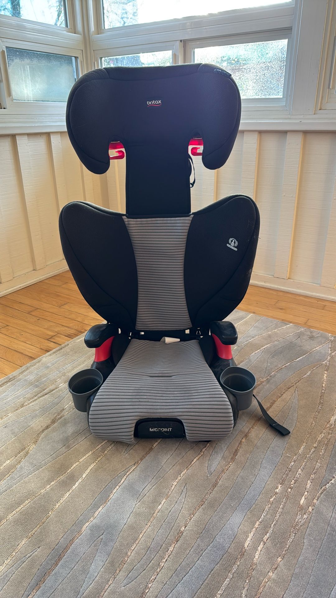 Britax Midpoint high-back booster car seat in good, clean condition. Includes adjustable headrest, side-impact protection, and dual cup holders. Trusted Britax safety quality and very comfortable for growing kids. No accidents, smoke-free home.