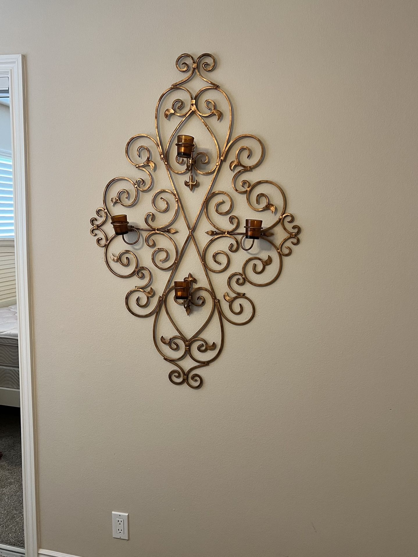 46” tall x 30” wide Metal wall art and candle holder . Holds votives candles or tealights. Like new condition . Nice for the holidays