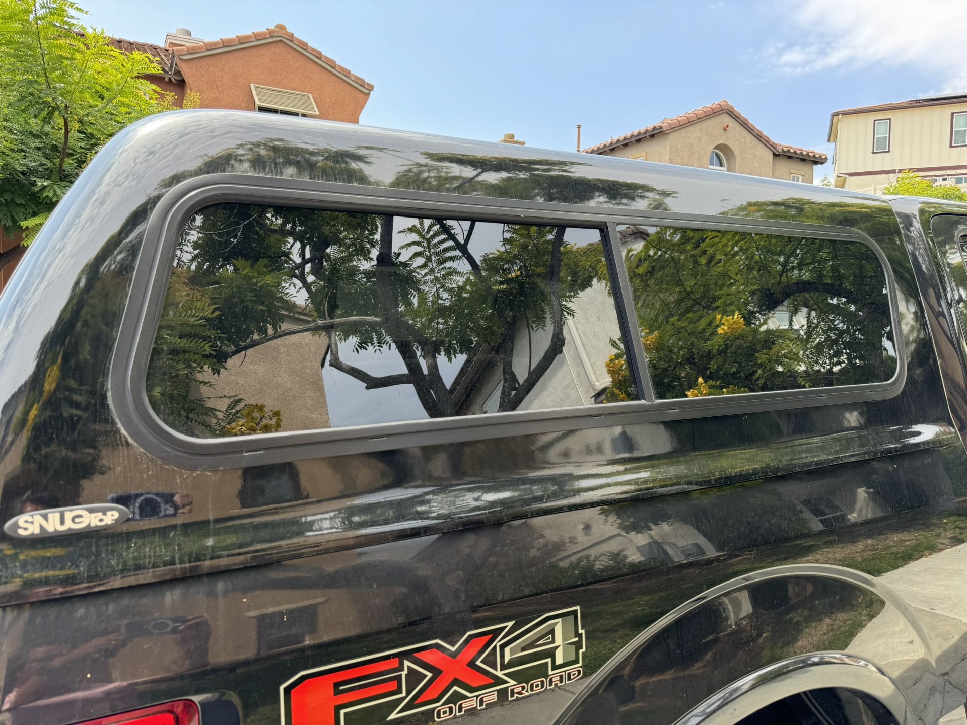 Rebel Model (Black) for F-150 short bed. Tracks installed on the roof of the cap. Also has a cab window.