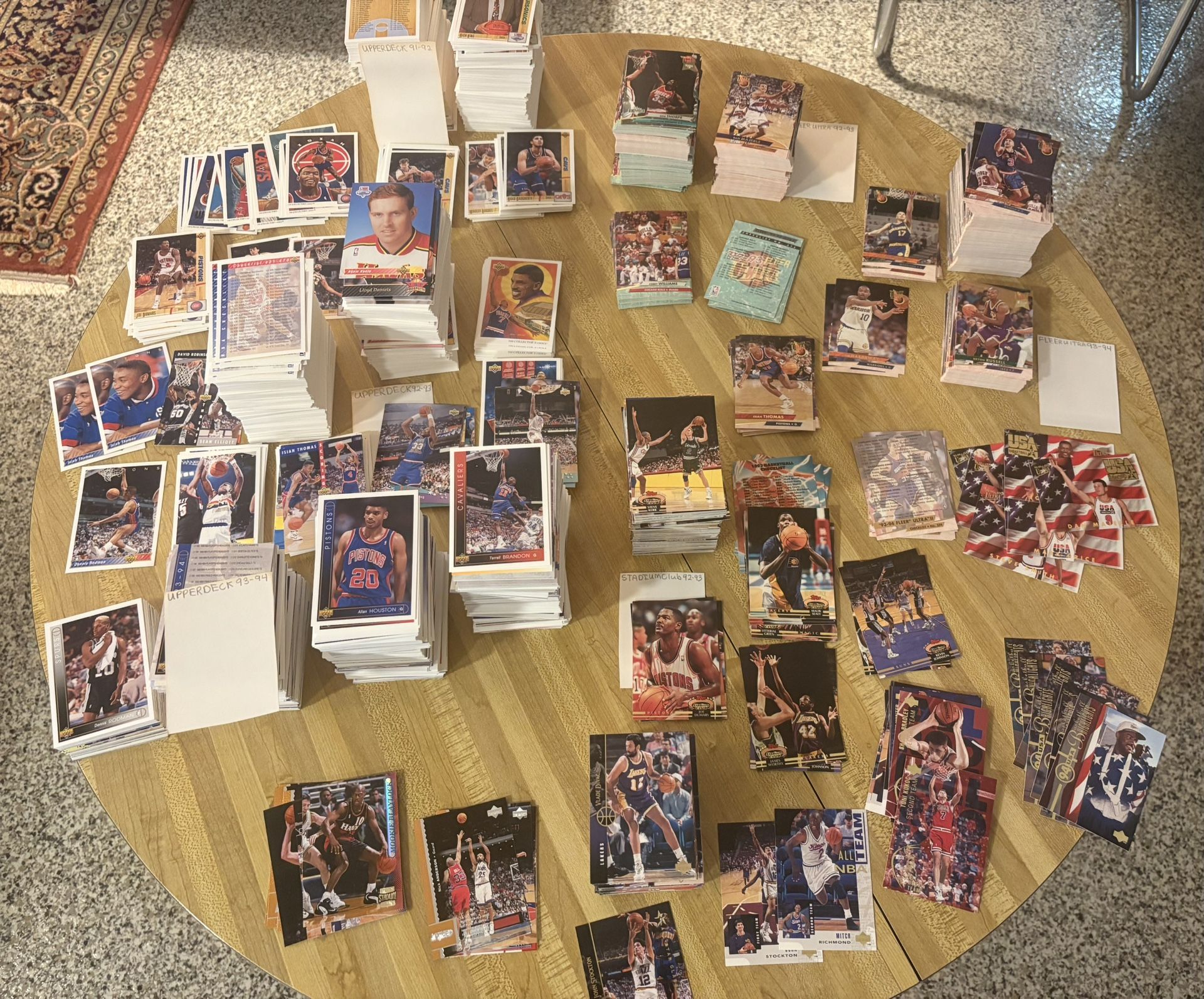 Large lot of roughly 3000 basketball cards from the 1990’s. Lots of base cards for completing sets and many stars, hall of famers and rookie cards. Cards range from 1991-92 Upper Deck series 1&2. 1992-93 Upper Deck series 1&2. 1993-94 Upper Deck series 1&2. 1994-95 Upper Deck series 1. 1992-93 Topps Stadium Club series 2. 1992-93 Fleer Ultra series 1&2. 1993-94 Fleer Ultra series 1&2. Stars include Dennis Rodman, Isiah Thomas, Dikembe Mutumbo and many more. All cards are in nice shape and come from a clean smoke free home.