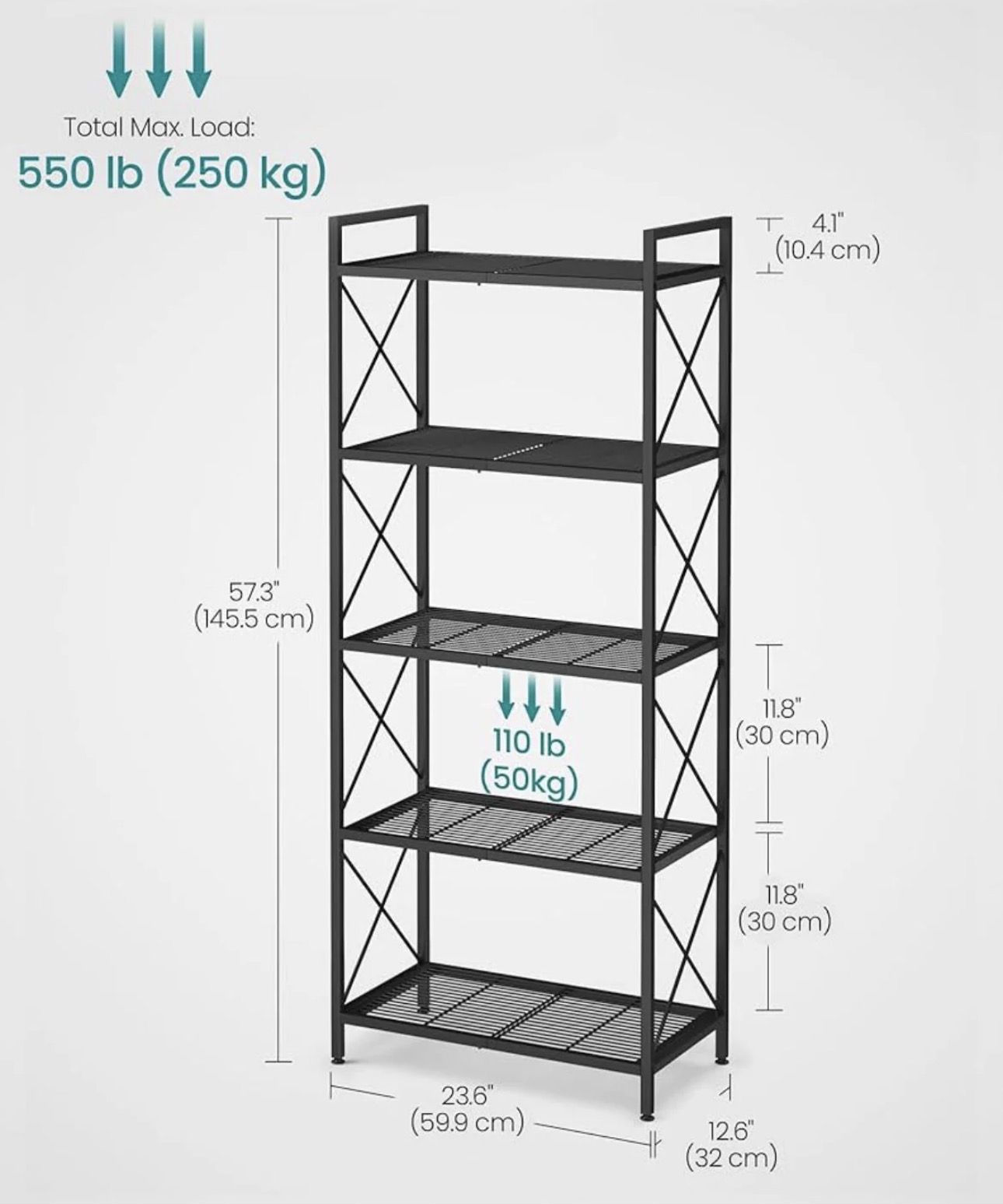 SONGMICS 5-Tier Metal Storage Rack Shelving Unit w/ X Side Frames Dense Mesh - Black