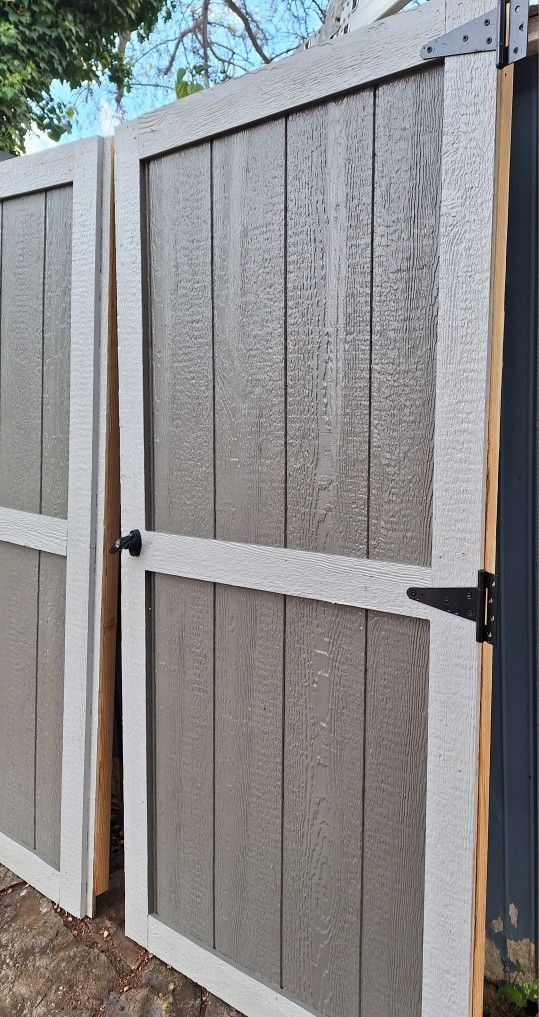 Includes 2 complete barn doors, removed from brand new $4200 12x10 Heavy Duty Shed (Made with T1-11 Plywood Siding) Includes ALL door latches, barn door hinges and diamond plate floor edge. Doors are completely built and ready to install. Doors are heavy Duty, swing solid, in Perfect condition