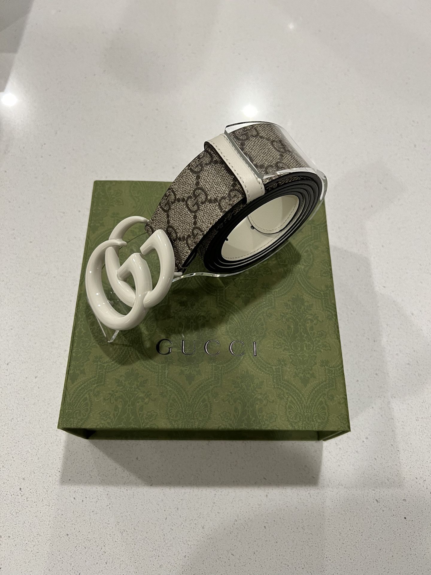 GG Marmont wide belt in size Gucci 100. Brand new with receipt, never worn. Comes with all original box, dust bag and Gucci care instructions, and happy to show receipt but not give as it has personal bank info and client information from Gucci. Sold for 520 in store plus tax, selling for 475$. Would make an amazing gift, for male or female, as most all Gucci belts are sold as unisex