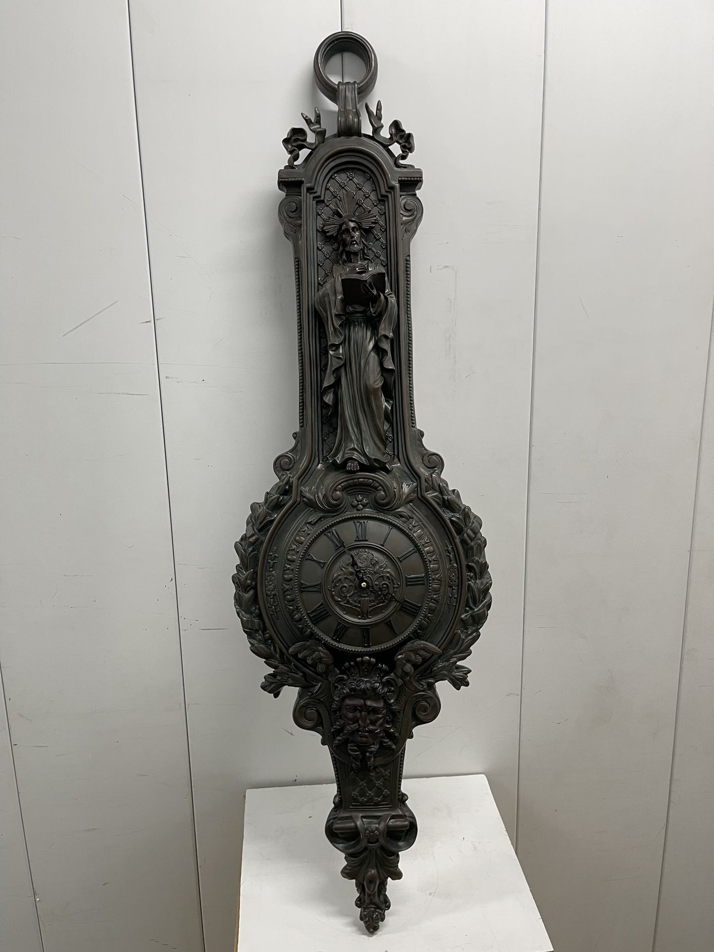 Add a touch of vintage charm to any room with this stunning wall clock. Crafted in the style of an antique statue, this clock features a unique abstract shape and multicolor fiberglass material. The clock is powered by a quartz battery and displays the time with non-numeric marks on an analog dial. Measuring 15 inches in length, 50.1/2 inches in height, and 5 inches in width, this wall clock is a perfect addition to any decor. Its matte finish and original design make it a one-of-a-kind piece that is sure to impress. Whether you're looking to add a touch of elegance to your living room or need a statement piece for your office, this antique-style wall clock is the perfect choice.