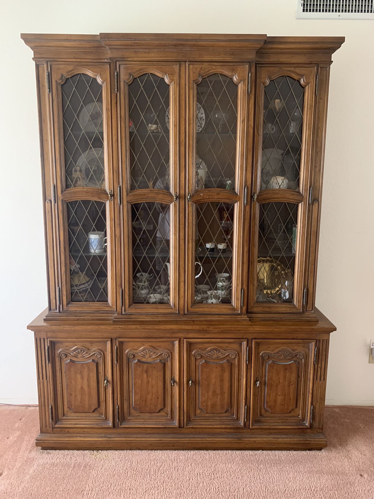 Drexel Heritage China Cabinet The bottom piece is 58 3/8” wide x 16” deep x 27” high. The top piece is 55” wide x 14 1/4” deep x 51” high $800 Cash only! No Zelle, etc
