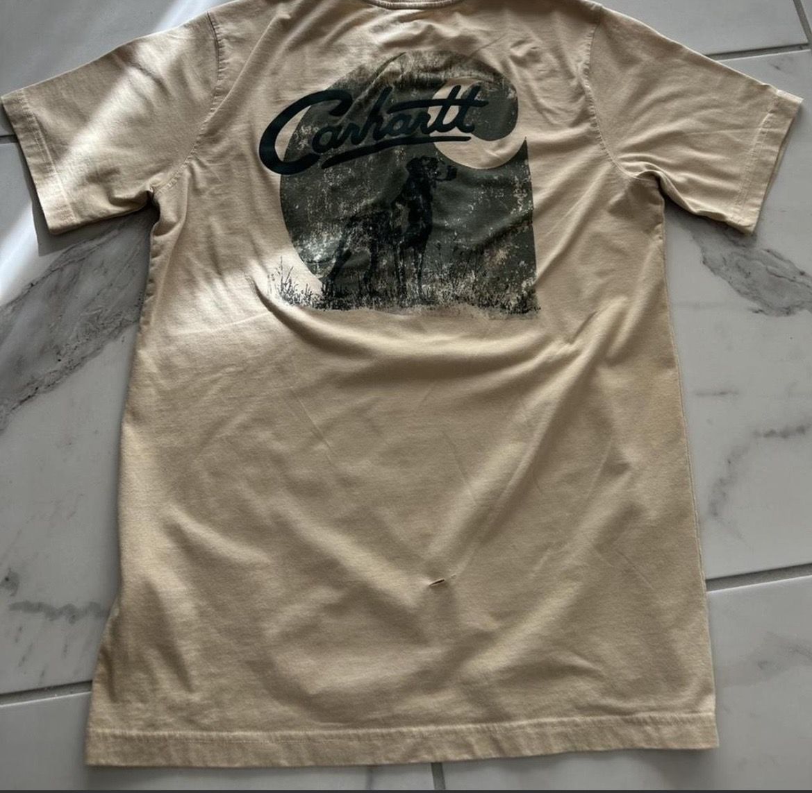 Carhartt tan pocket tee with dog design relaxed fit decent condition Shoulder to hem- 27.5 in Pit to pit- 17.5 in