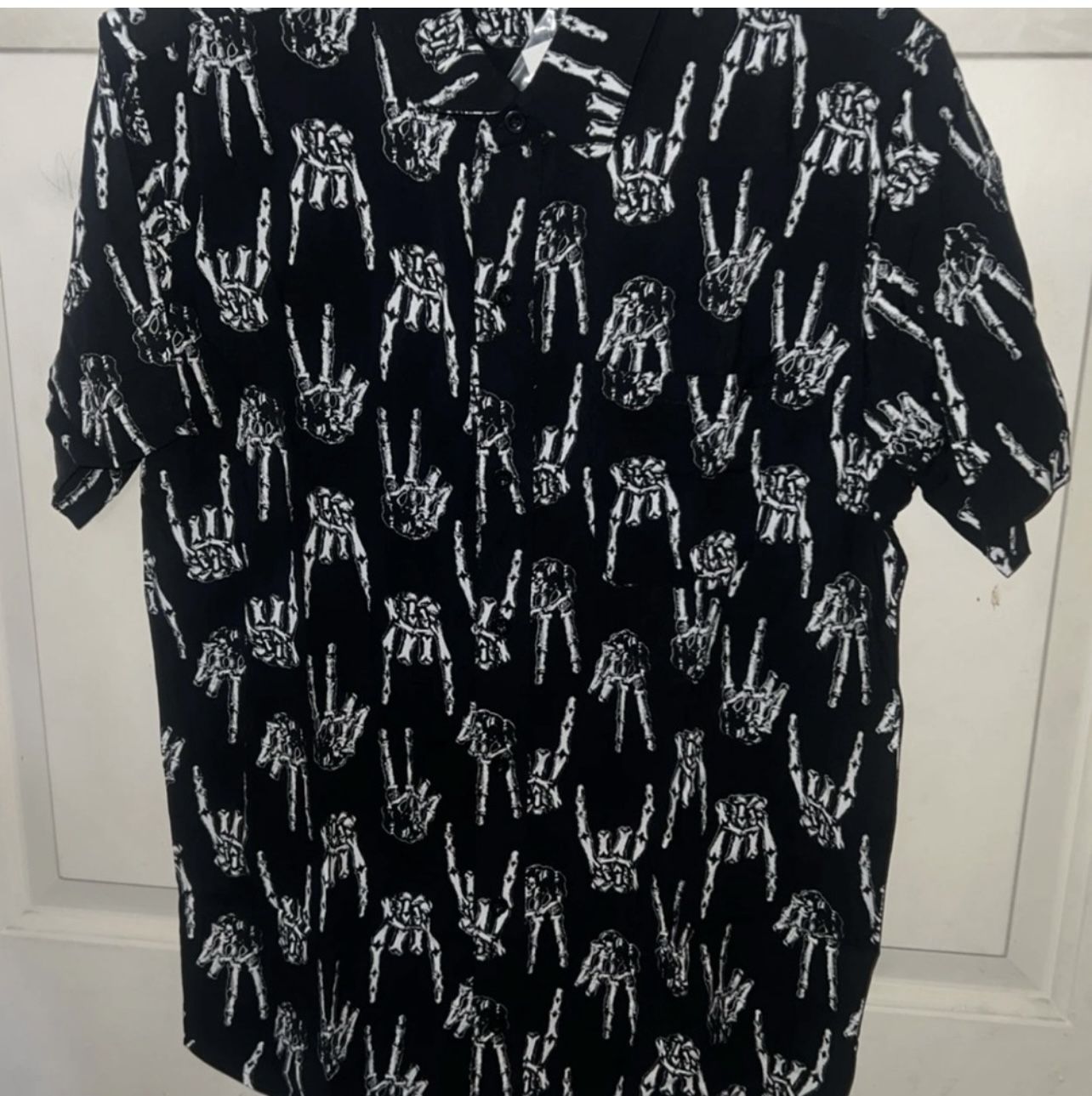 This woven button-up features an allover design of white skeleton hands throwing up peace signs and "rock on" symbols on a black background. 100% rayon. Left chest pocket. New with tags. Pick up only.