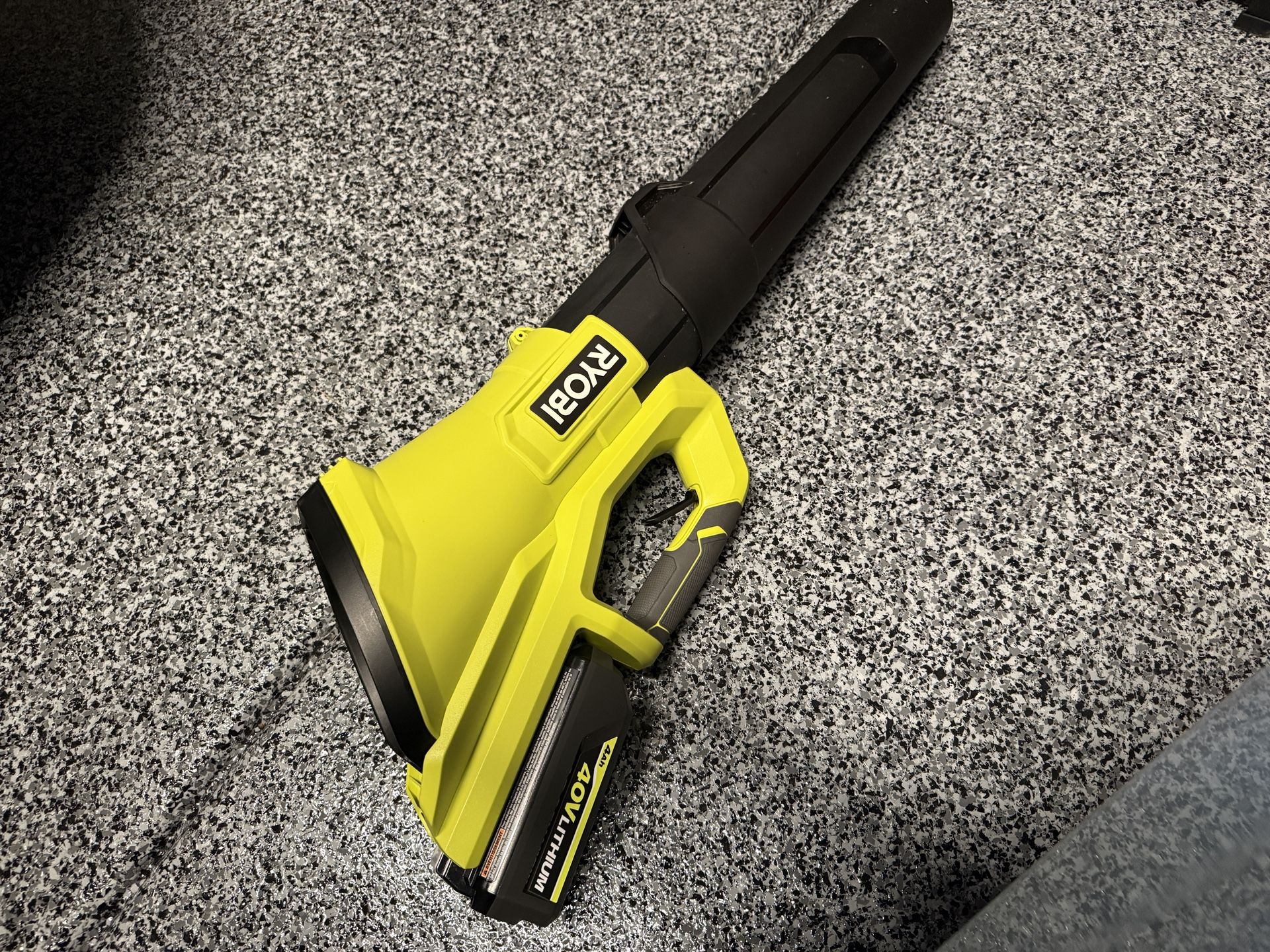 Ryobi 40V 120 MPH 550 CFM Cordless Battery Leaf Blower With 4.0 Ah Battery and Charger- clean and used a few times only -Great for clearing damp/dry leaves or yard debris. -Achieve over 75 minutes of runtime using included 40V 4Ah cordless battery. -Adjustable speed, control the output of air with the variable speed trigger -Lightweight design -Easily hang and store using integrated keyhole. -Part of the RYOBI 40V System where any 40V battery works with any 40V product