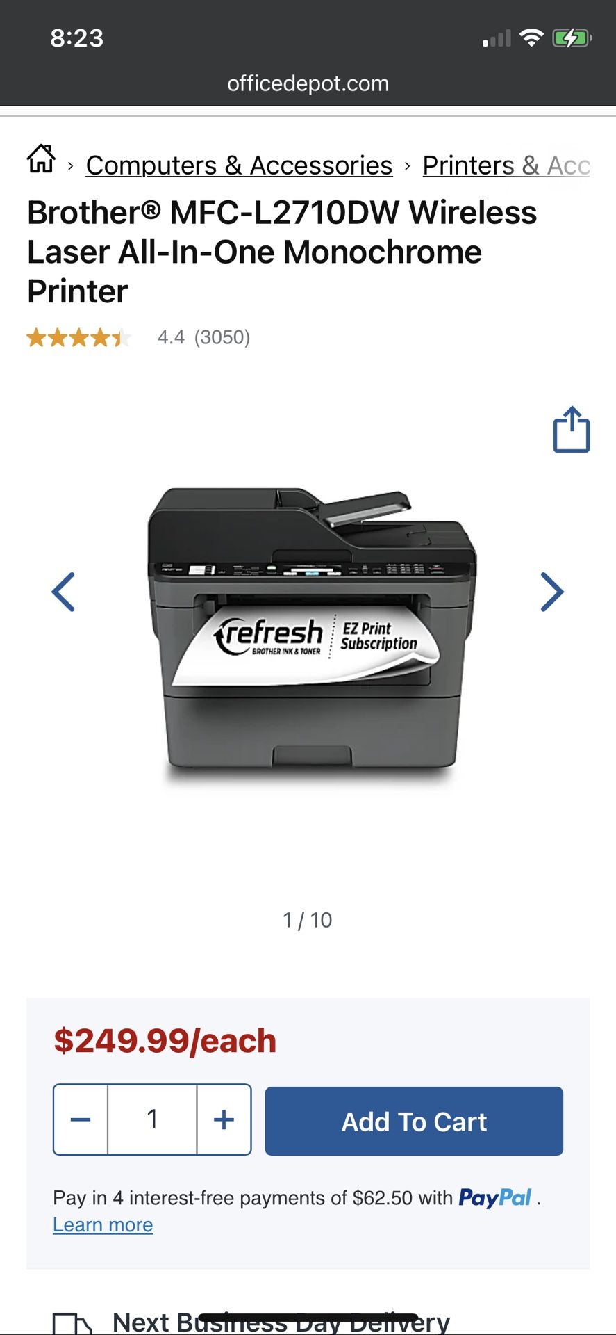 Print and copy documents with this black Brother multifunction laser printer. Print speeds of up to 32 pages per minute and the 50-sheet automatic document feeder simplify bulk jobs, while automatic duplex printing saves paper. This Brother multifunction laser printer has a 250-sheet paper tray to minimize the frequency of refills, and the manual feed slot allows use with card stock and envelopes. Retail $250