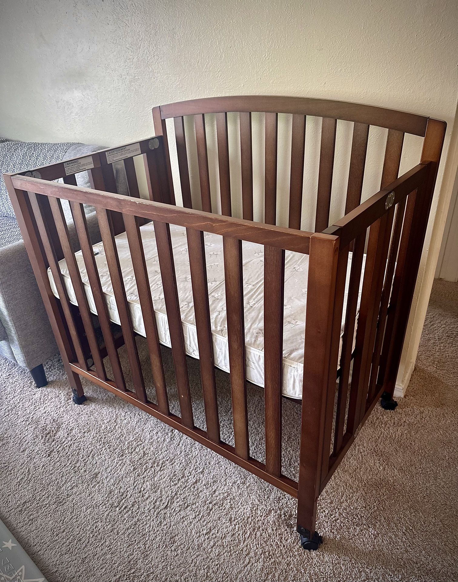 Super practical and perfect for small spaces. This crib folds flat, has wheels for easy moving, and grows with your child. + Serta Mattress ✔️ 3-in-1: Mini Crib → Twin Bed ✔️ Portable & space-saving ✔️ Solid wood, non-toxic finish ✔️ Meets all safety standards ✔️ Clean, barely used Great for apartments, nurseries, or grandparents’ homes. 📩 Message me if interested!
