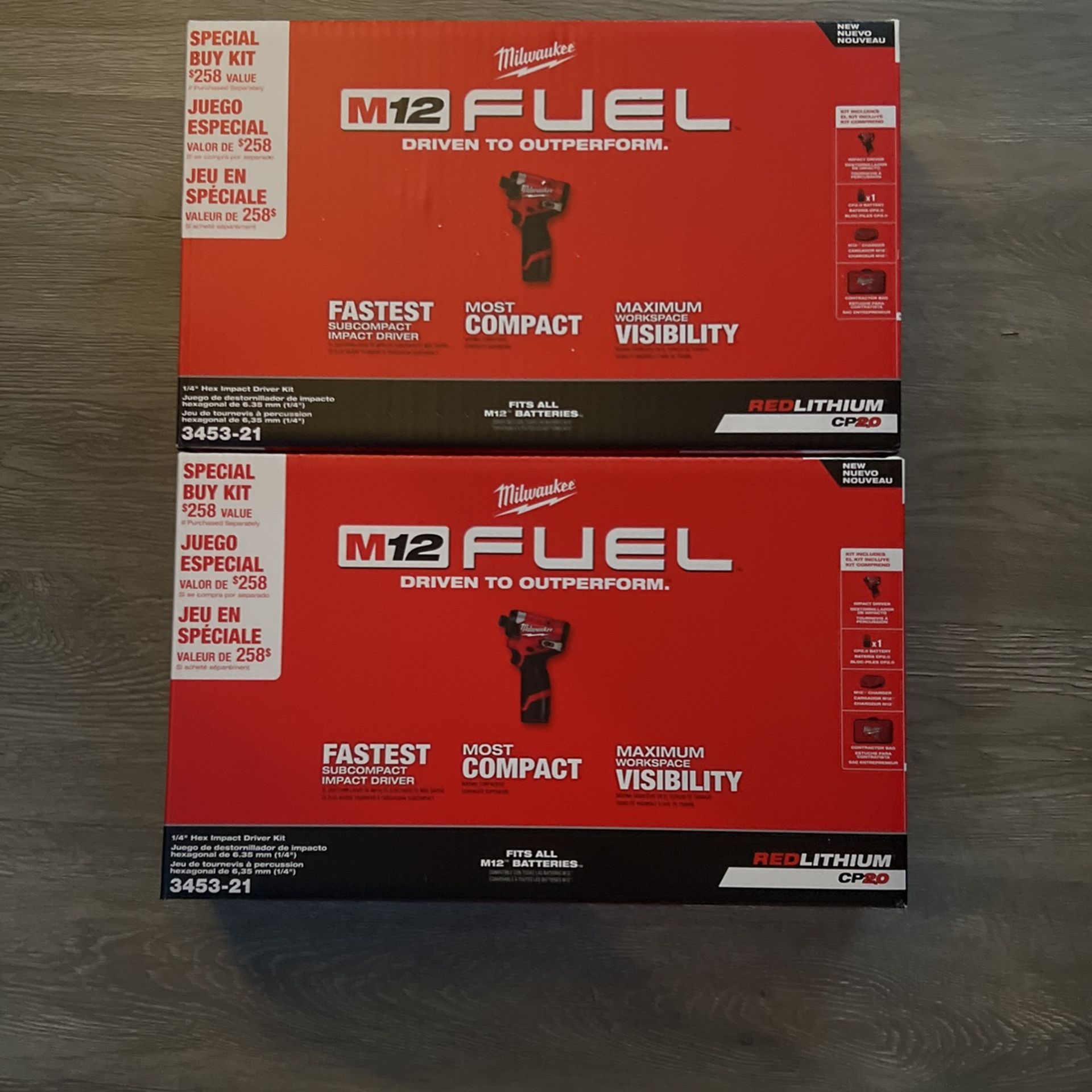 Both in box and brand new never been opened, the picture with the carrying case was my personal one. Comes with drill, battery, case, and charger.