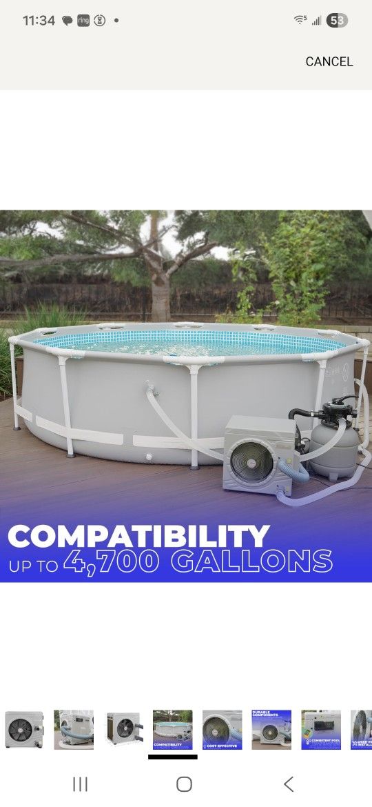 Pool heater for 4700 gallon pool. Purchased on amazon for $750.00 only used for 1 week. My pool was too big for it, my pool is 10,000 gallons but it does work and with very little energy. Normal plug in doesn't overload electrical. It made a difference in my pool and my pool was more than twice the size it called for. Text or call me at (contact info removed)