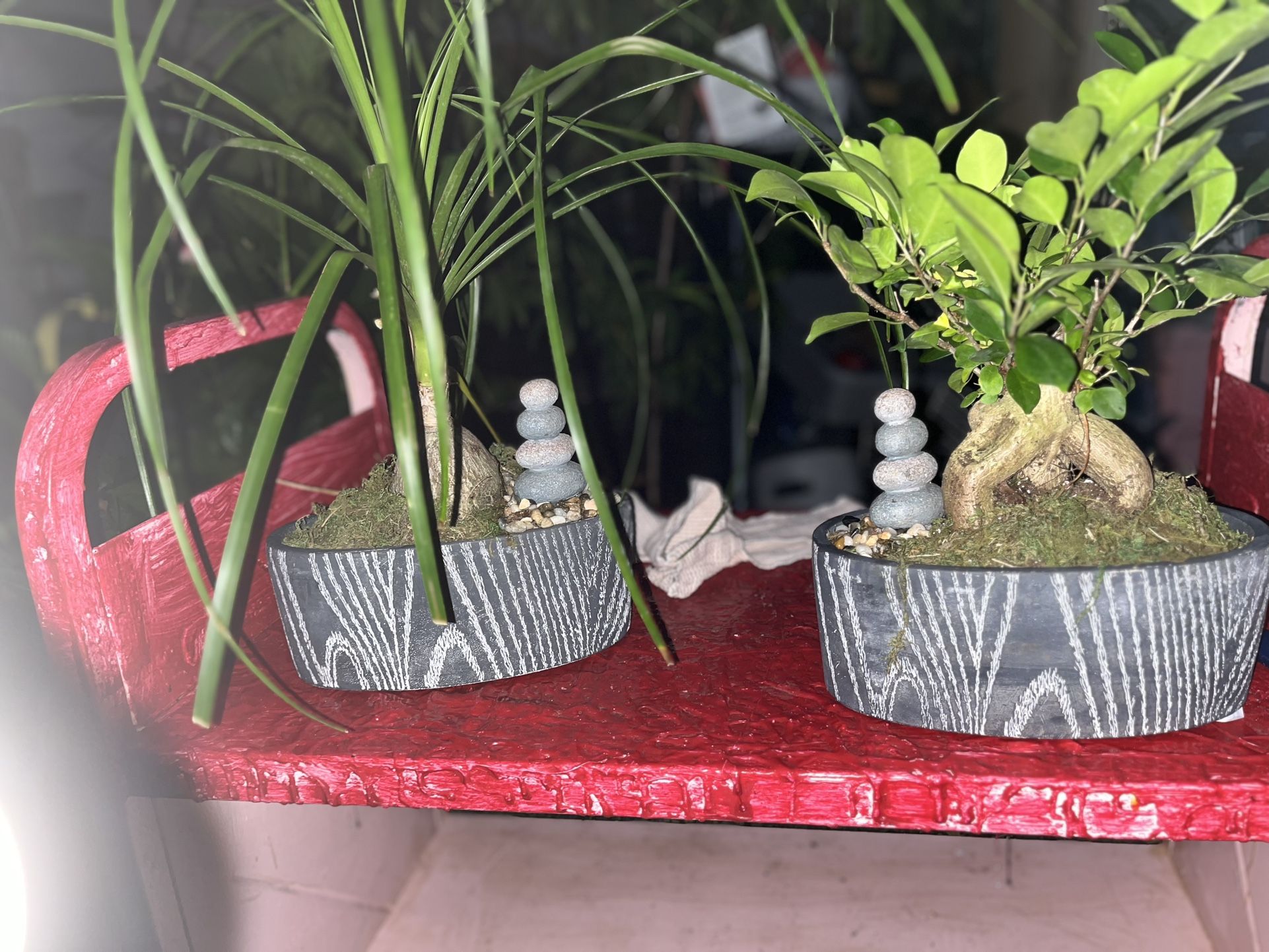 1 ponytail Pom, and 1 ficus Gensing Bonsai tree, retail for these two plants was over $250, the ponytail Pom is about 12 inches tall and the ficus gensing is roughly 8-10 inches tall, both plants are planted in planters that are 10 inches long, 4 inches wide, and about 4 inches deep , planted with moss and stones packed very tightly as Bonsai trees usually are. And both plants have stacked Riverstones balancing beside them, I’m asking for $100 for both of them or $60 each