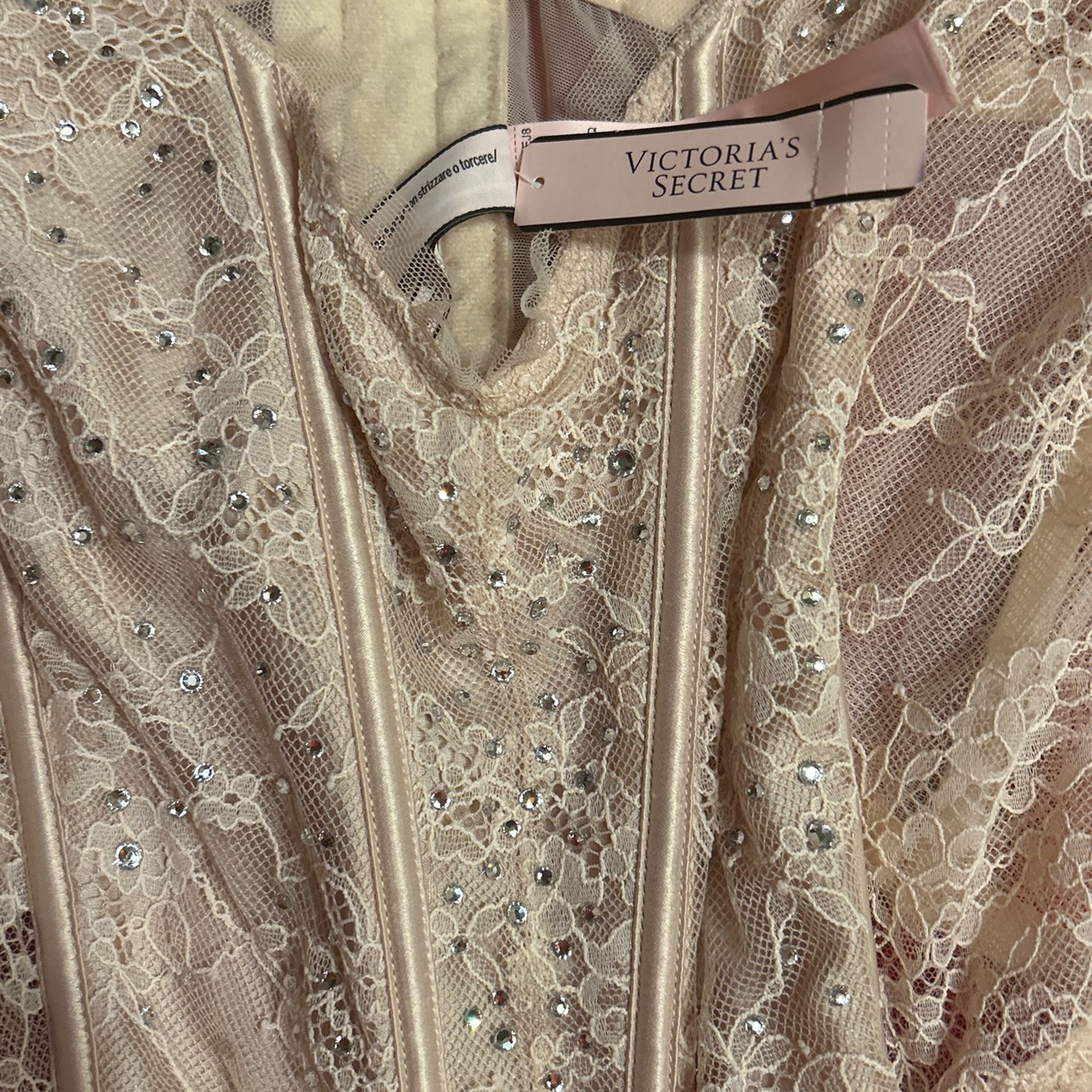 Brand new with tags-Great Gift🎁 Victoria's Secret Lace Corset Bustier Long Sleeve Bra Top -rhinestone embedded on front featuring : Size M-DD -Beige -floral lace, ruffle trim and a sprinkle of glistening rhinestones -Unlined -Boning for support -Back hook and eye closure -Stretch lace sleeves Original$89.50 Now$50! No Holds!!