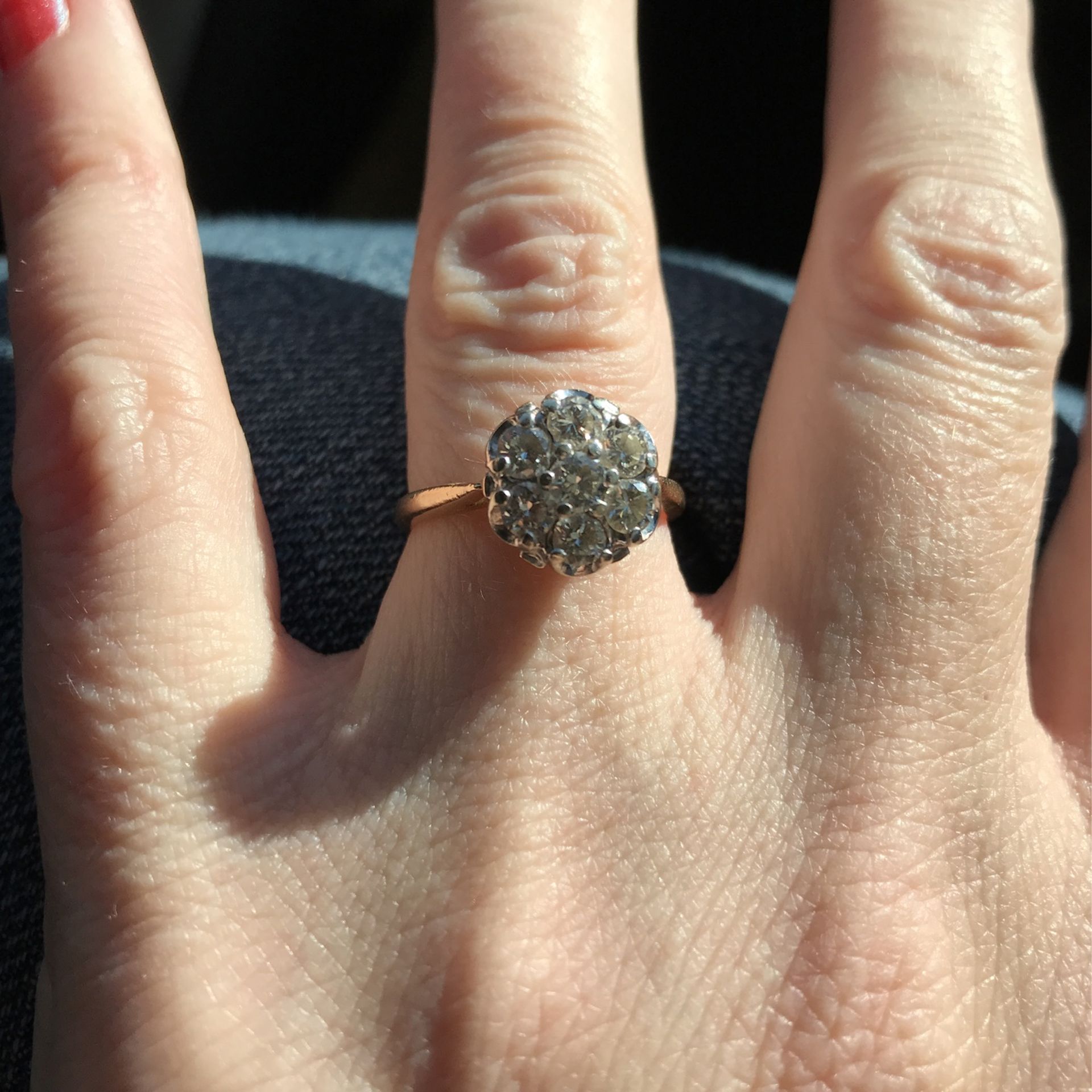 Over 40 year old, 14 karat gold diamond cluster. Very clear diamonds very nice was a priest 40 years ago for $1500. A touch of elegance classic vintage piece. Asking 1800 or best offer