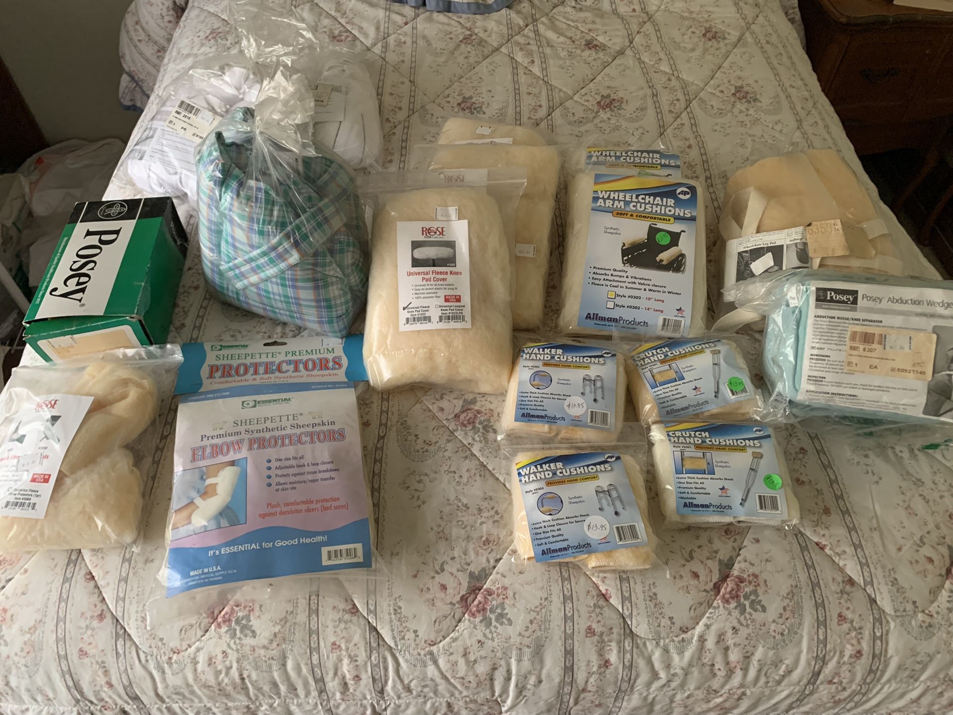 1/2 price from package prices shown !! NEW in original packaging Protectors for: HEELS, ELBOWS, KNEE SCOOTER CRUTCH PADS, - hands, under arm WALKER PADS, WHEELCHAIR LEGS PADS Two styles: Fleece and Padded Medical Supply Store closing inventory Chino, Ca 91710 Tap on my profile photo for other items I have posted